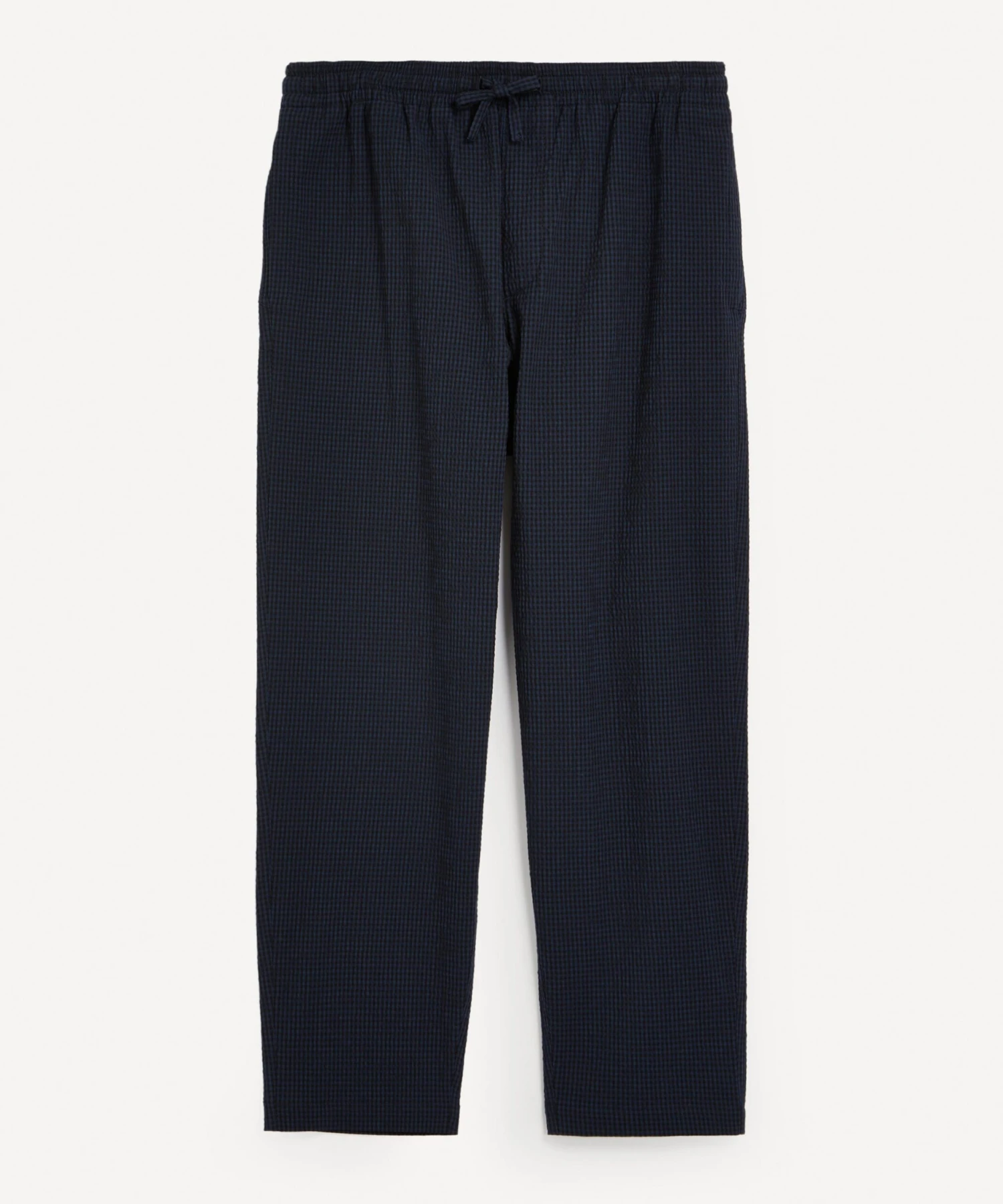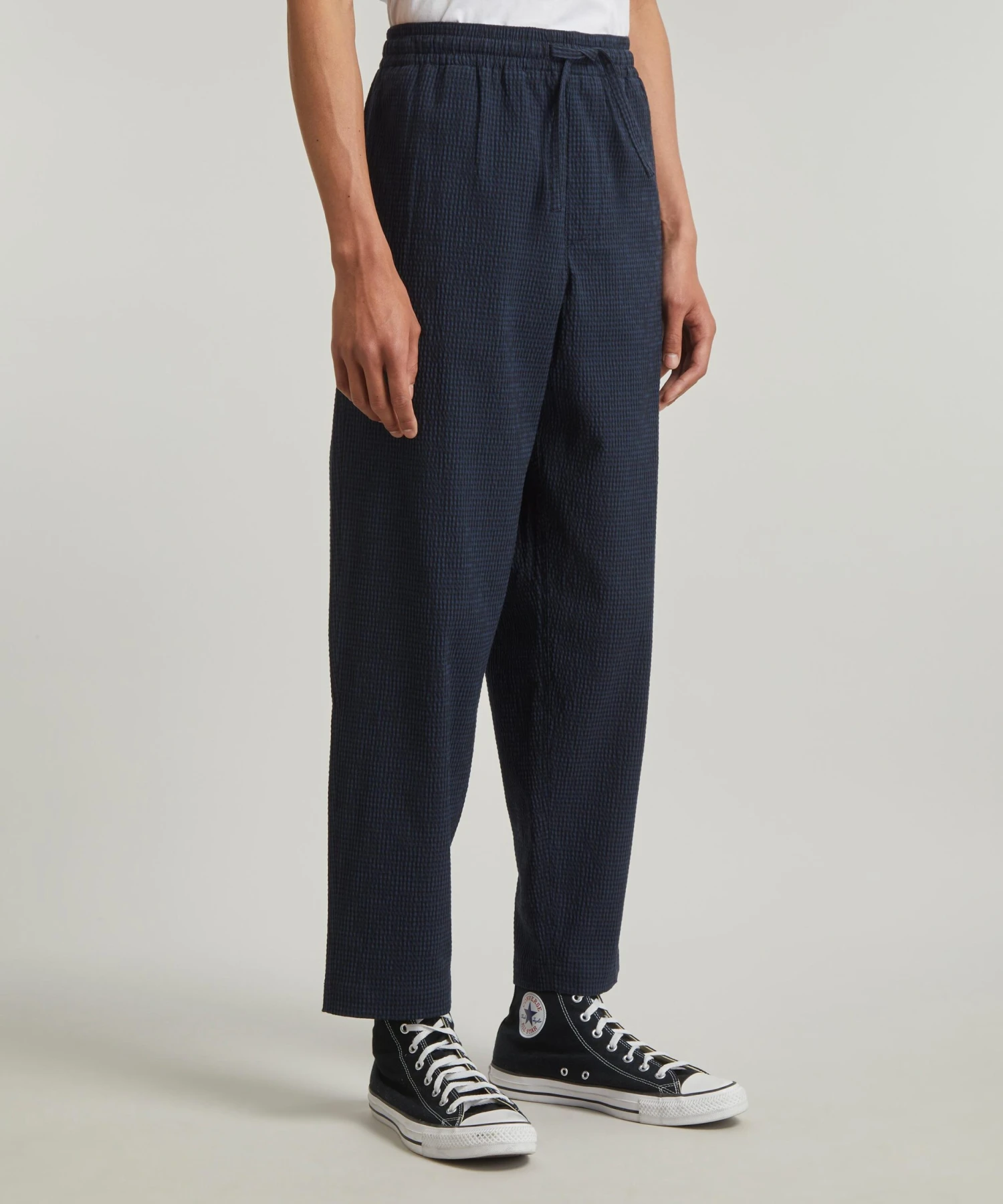Cut from an Italian crinkle check cotton-blend fabric with a ditsy gingham pattern, these skater-style trousers boast a relaxed, wide-leg with a slight taper. Super-comfortable on and off the skate-board, they’re fitted with an elasticated drawstring waistband.