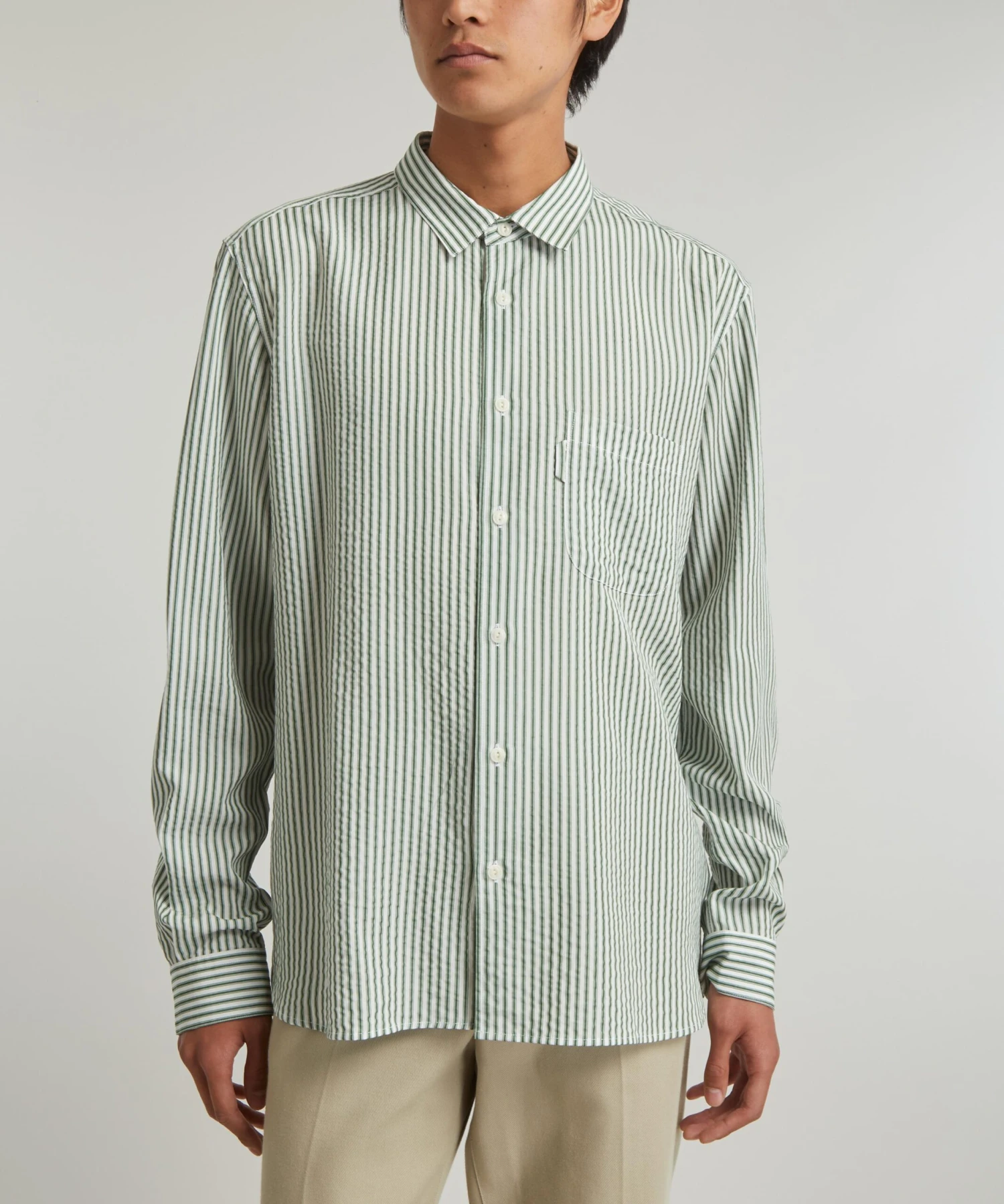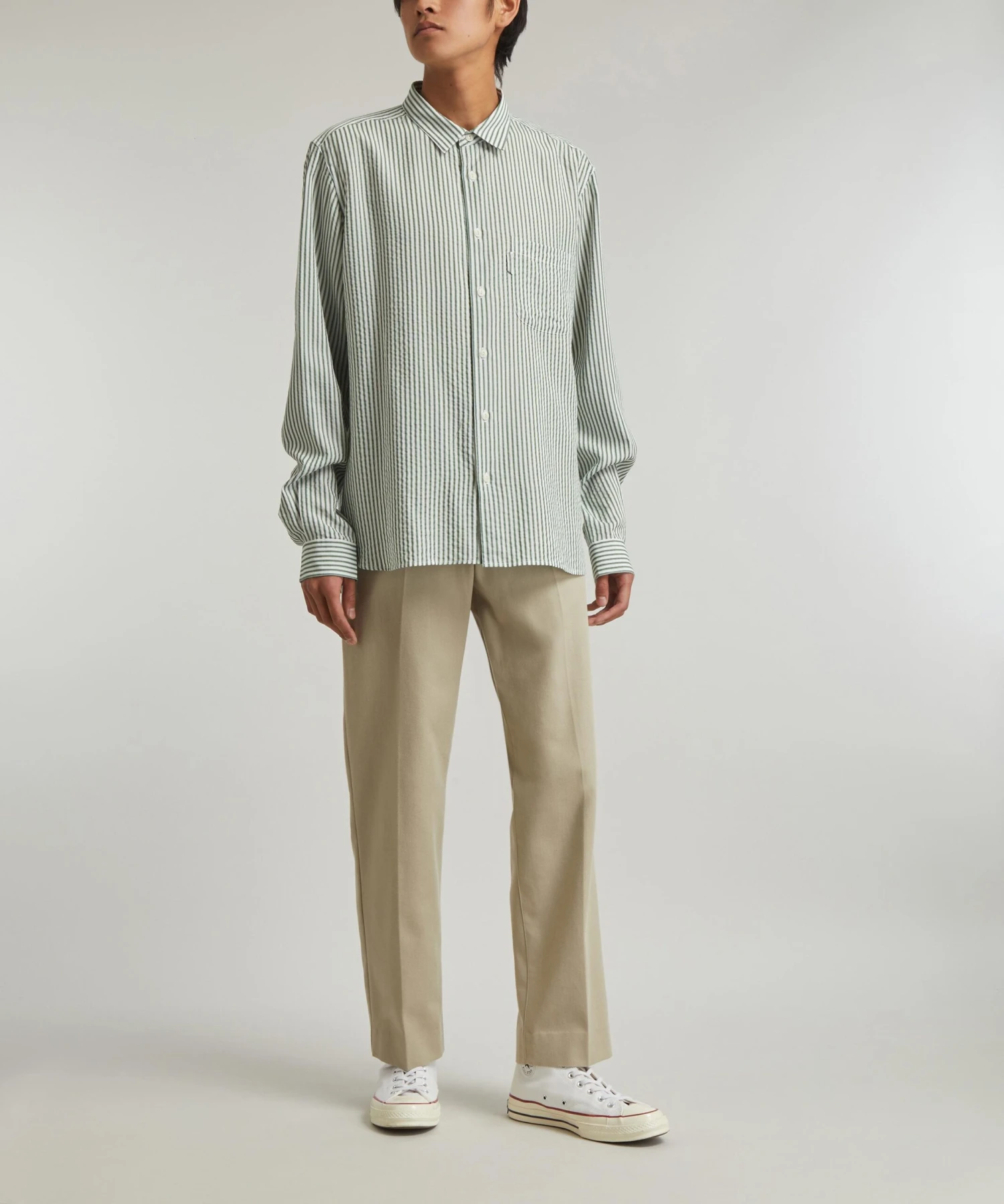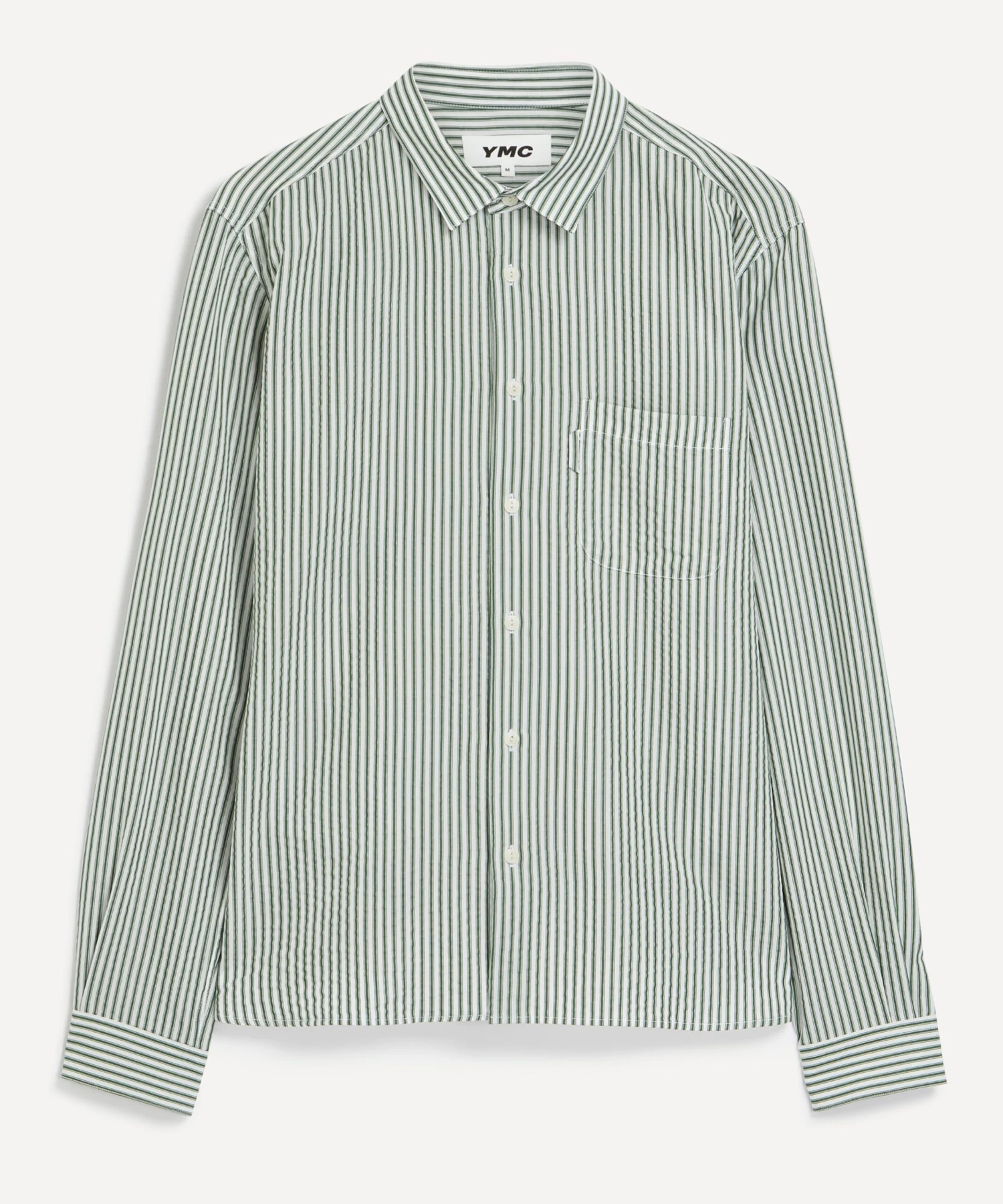 YMC’s Curtis Green Ecru Stripe shirt is a casual staple, informed by the label’s utilitarian aesthetic.