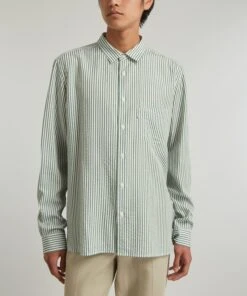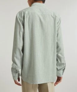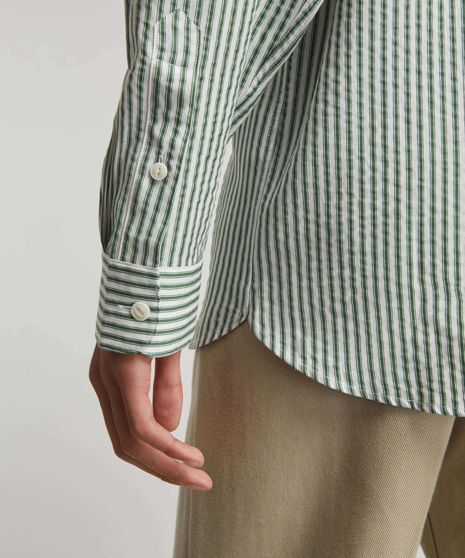 A homage to the shirting of leading man Tony Curtis, this utility-inspired shirt is crafted from a lyocell fabric with a fine, green vertical striped pattern throughout. A classic design with a pointed collar and corozo button front fastening, its single chest patch pocket is finished with a self-fabric loop.