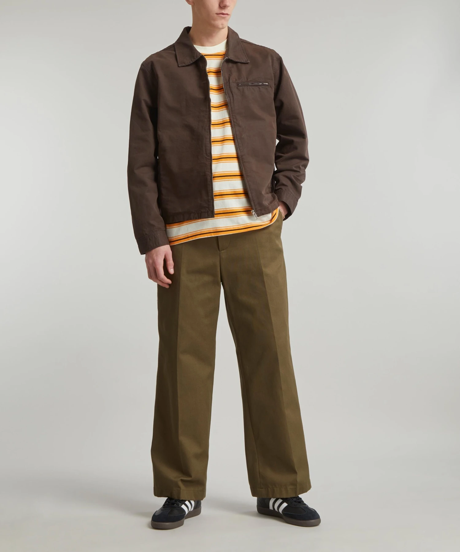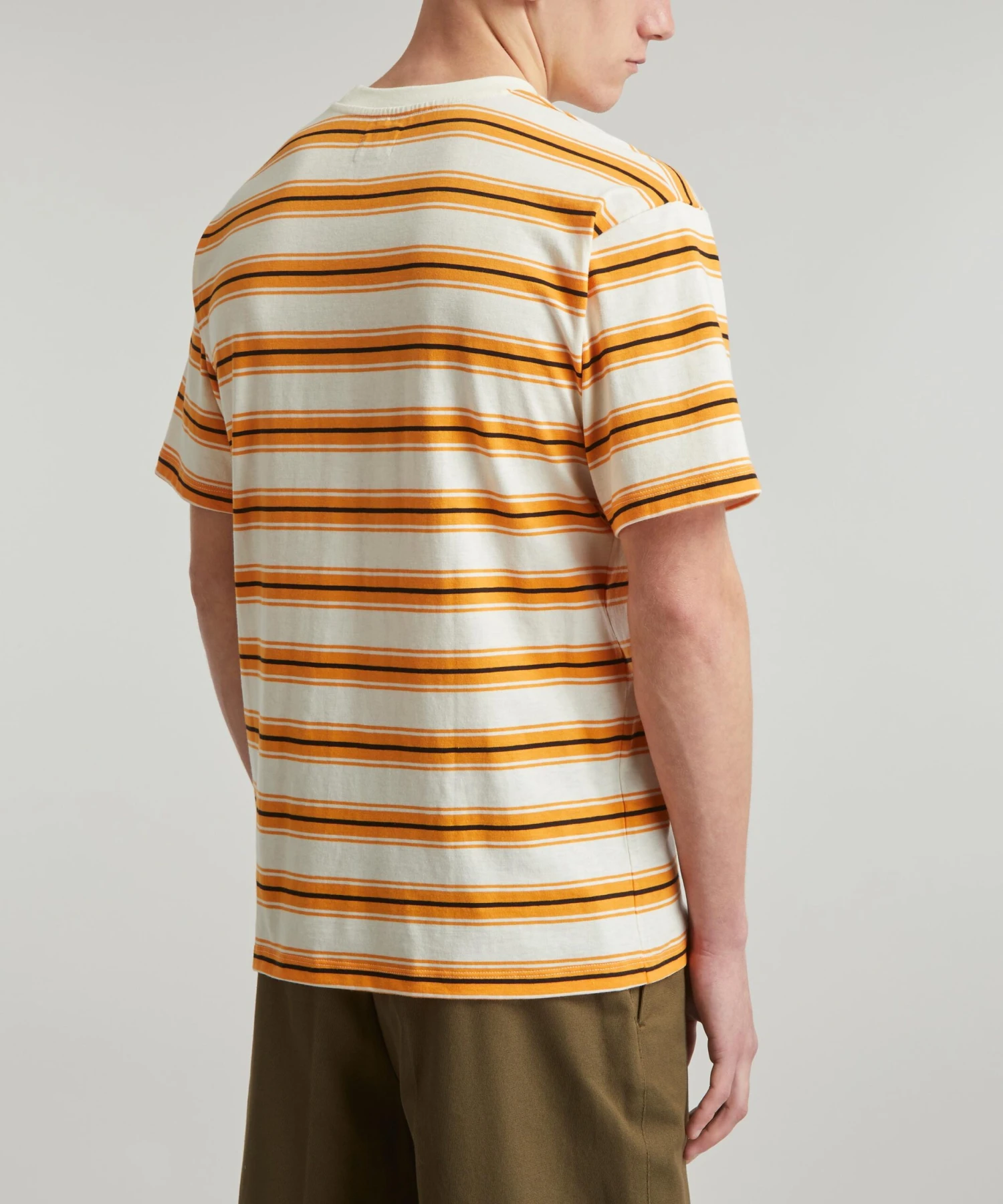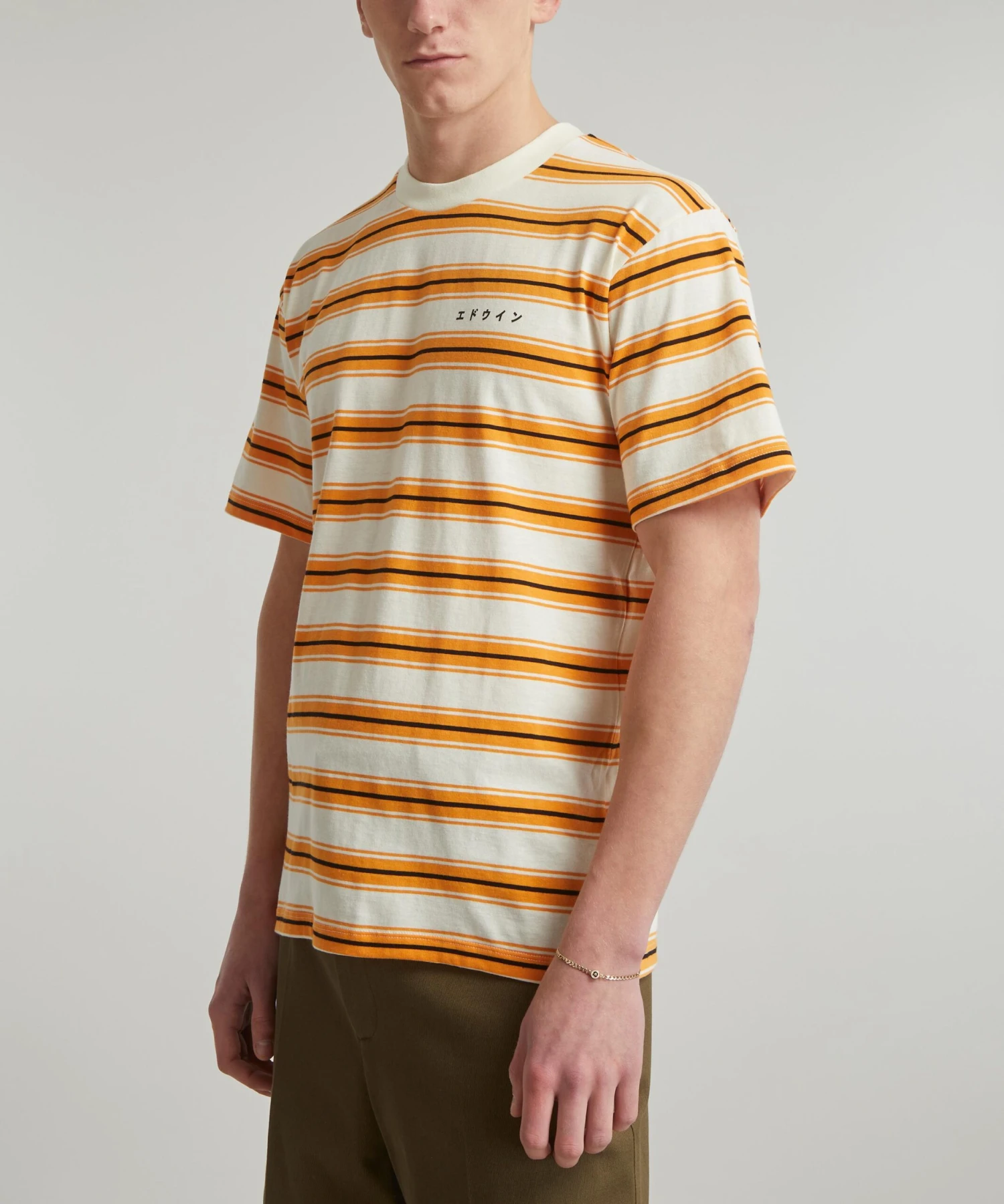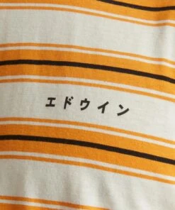 Elevate your everyday casual edit with the stripy orange Quarter t-shirt from Japanese denim brand, Edwin. Crafted from 170gr/m² single cotton jersey, it features a classic ribbed collar, short-sleeves and the brand’s logo in Japanese characters at the chest.