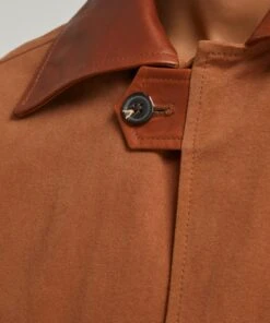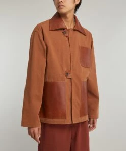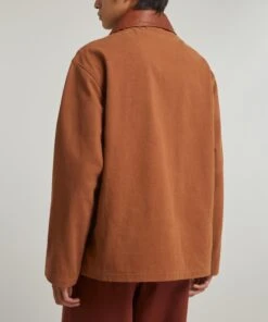 Inspired by a vintage bag from the 1930s-1940s, its original design has been adapted to a classic workwear silhouette with its boxy fit. Constructed from cotton, its contrast cutaway collar, patch pockets and two tab buttons are crafted from smooth, tanned leather.