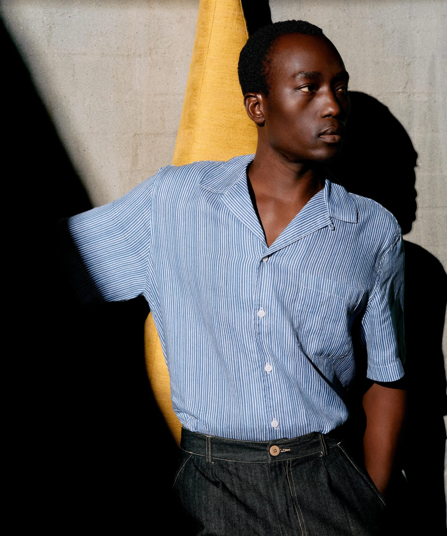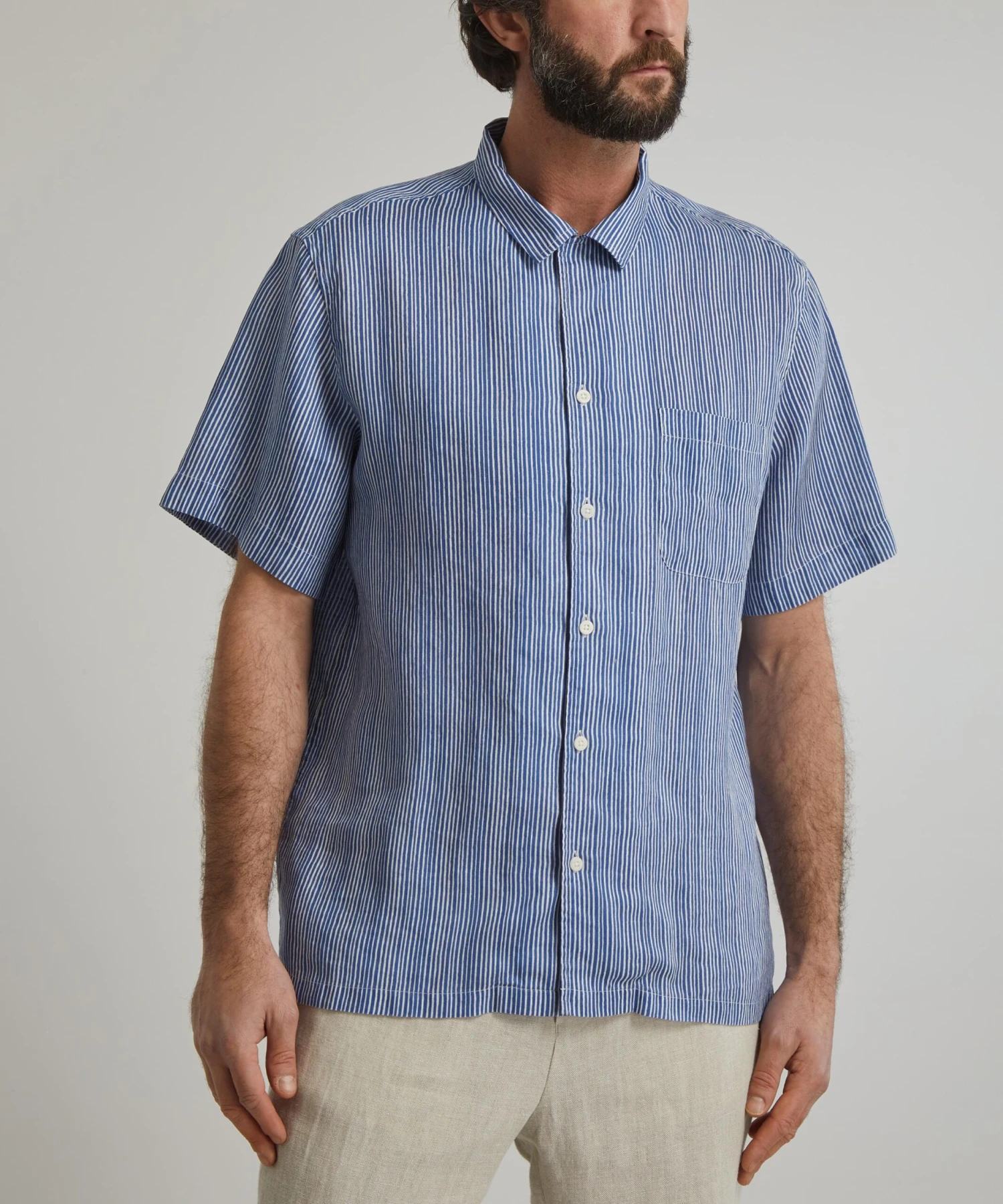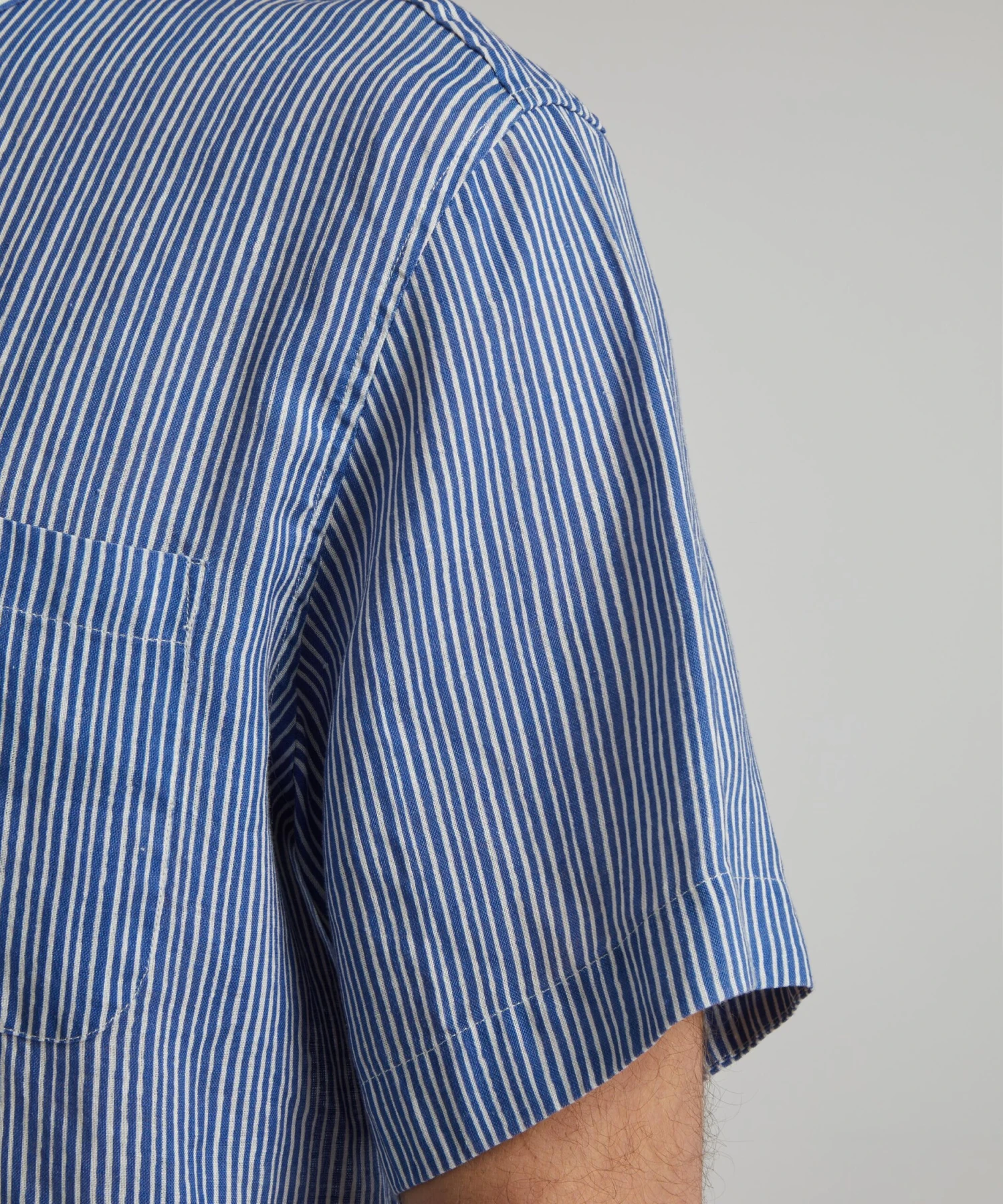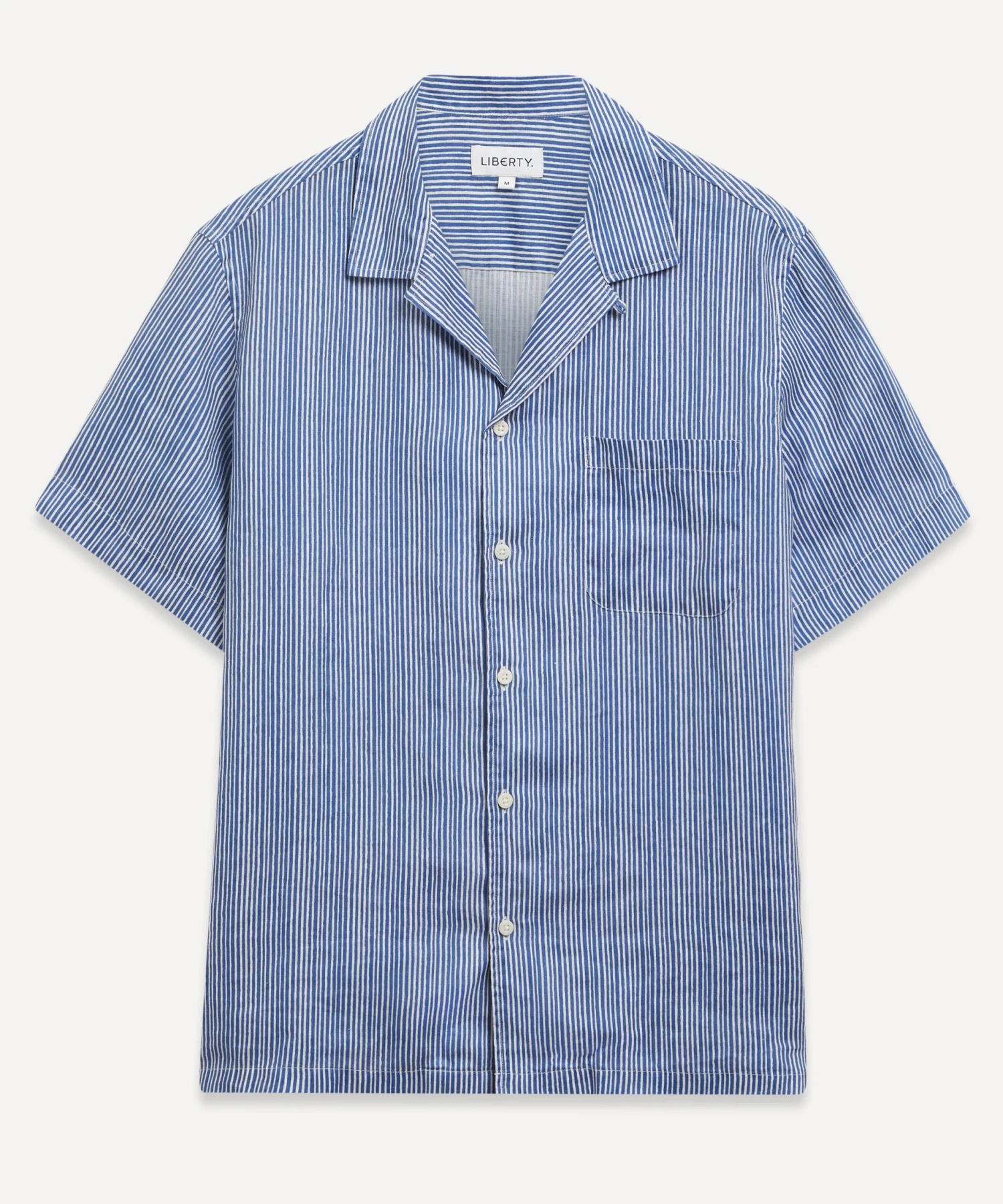 Our Kingly shirt fit is relaxed and easy to wear, with an open neck and a flattering, short sleeved silhouette, here featuring the Elements print from the FuturLiberty collection. FuturLiberty is an exploration of the unexpected in the Liberty archive, resulting in a reinvention of Liberty Fabrics – inspired by, and celebrating the artistic movements of Futurism, Vorticism, and a century of avant-garde. Elements, here constructed from Hemp, focusses on a section of stripes that feature in the Lines Ballet print. The lines have been extended by hand to give the sense of a painted line, full of movement. This is Liberty’s relaxed and witty re-interpretation of the traditional, formal stripe seen in shirting.