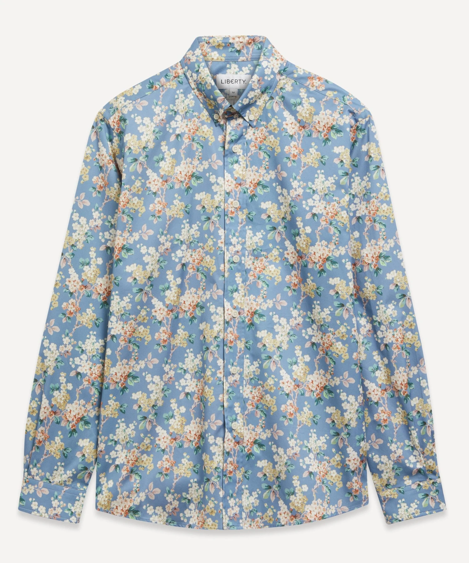 Developed to complement every build, our Alex men’s shirt has a classic silhouette that looks equally good fully buttoned or undone as an overshirt. Constructed from heavier-weight 185gsm cotton twill and finished with corozo nut buttons, the shirt is expertly printed in Italy with our Josephine design from our archival AW18 palace garden collection. Drawn from Liberty’s vast archive of hand-painted furnishing fabric designs, the print features intricate blossoms, branches and leaves. For your off-duty edit, layer the long-sleeved shirt over a clean white tee with shorts and sneakers, or elevate with suit trousers and a jacket for a classic look.