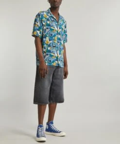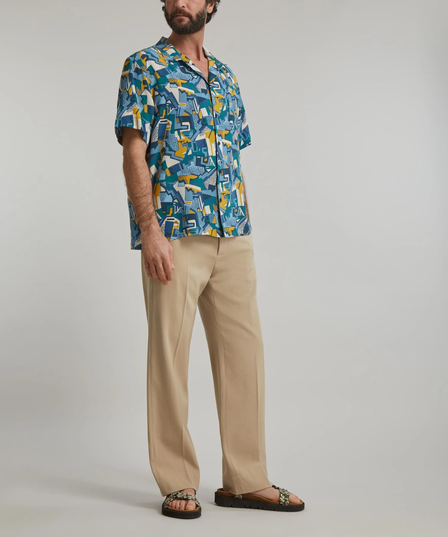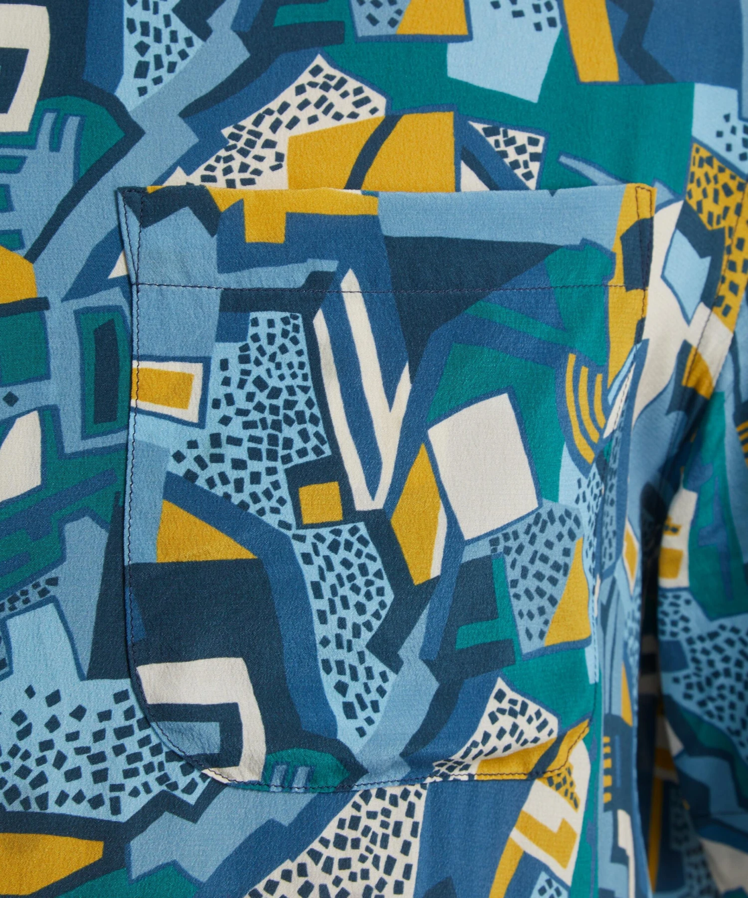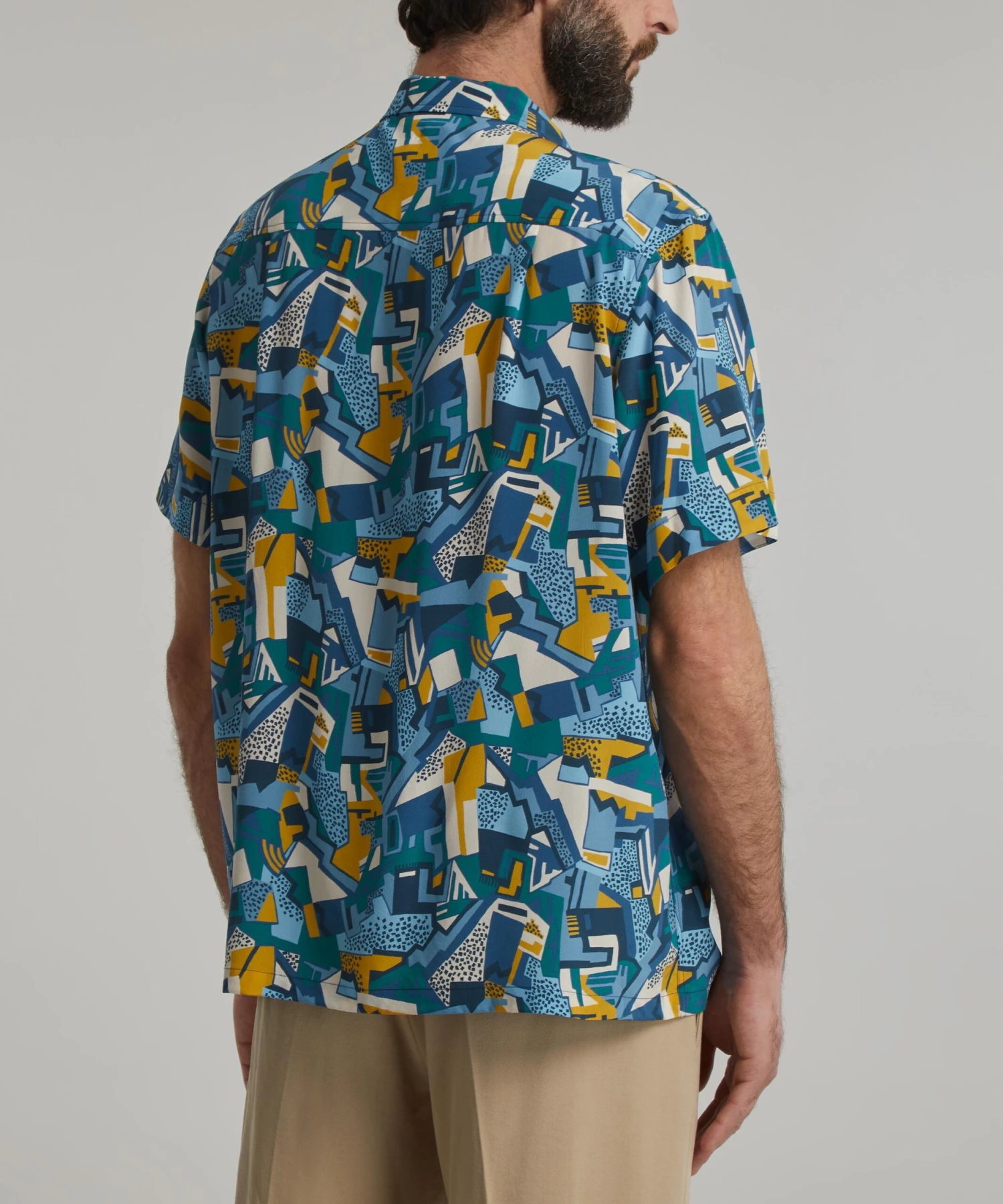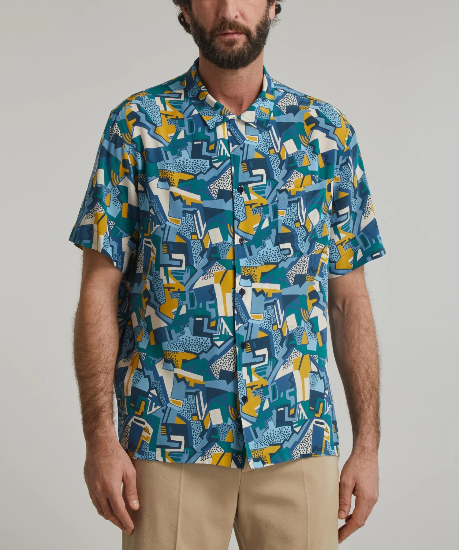 Our Kingly shirt fit is relaxed and easy to wear, with an open neck and a flattering, short sleeved silhouette, here featuring the Parade print from the FuturLiberty collection. FuturLiberty is an exploration of the unexpected in the Liberty archive, resulting in a reinvention of Liberty Fabrics – inspired by, and celebrating the artistic movements of Futurism, Vorticism, and a century of avant-garde. Parade, here constructed from silk crepe de chine, is a reinterpretation of a design from the Tango Collection, a collection produced in 1966/7 by Bernard Nevill, and features bold geometric shapes evocative of a futurist industrial cityscape. Endlessly versatile, wear this shirt with everything from shorts and knits to loose linen trousers and sandals for easy, off-duty appeal.
