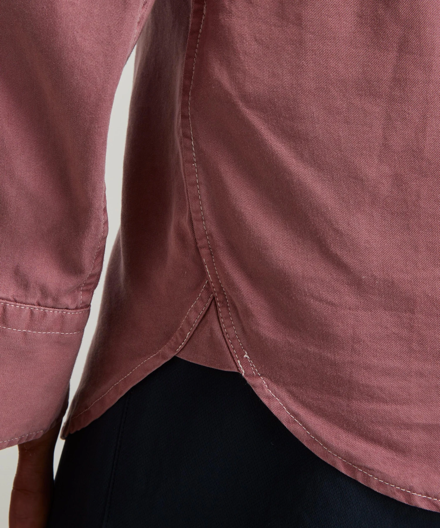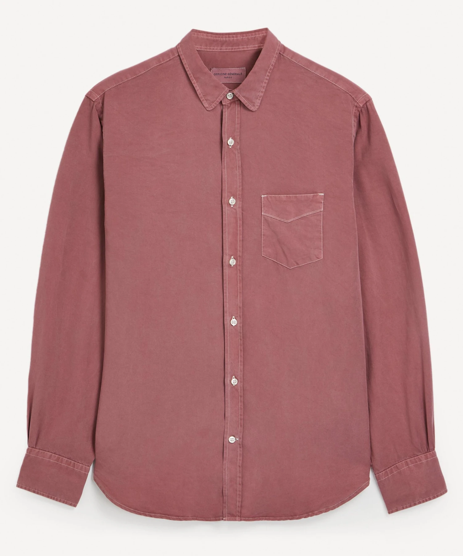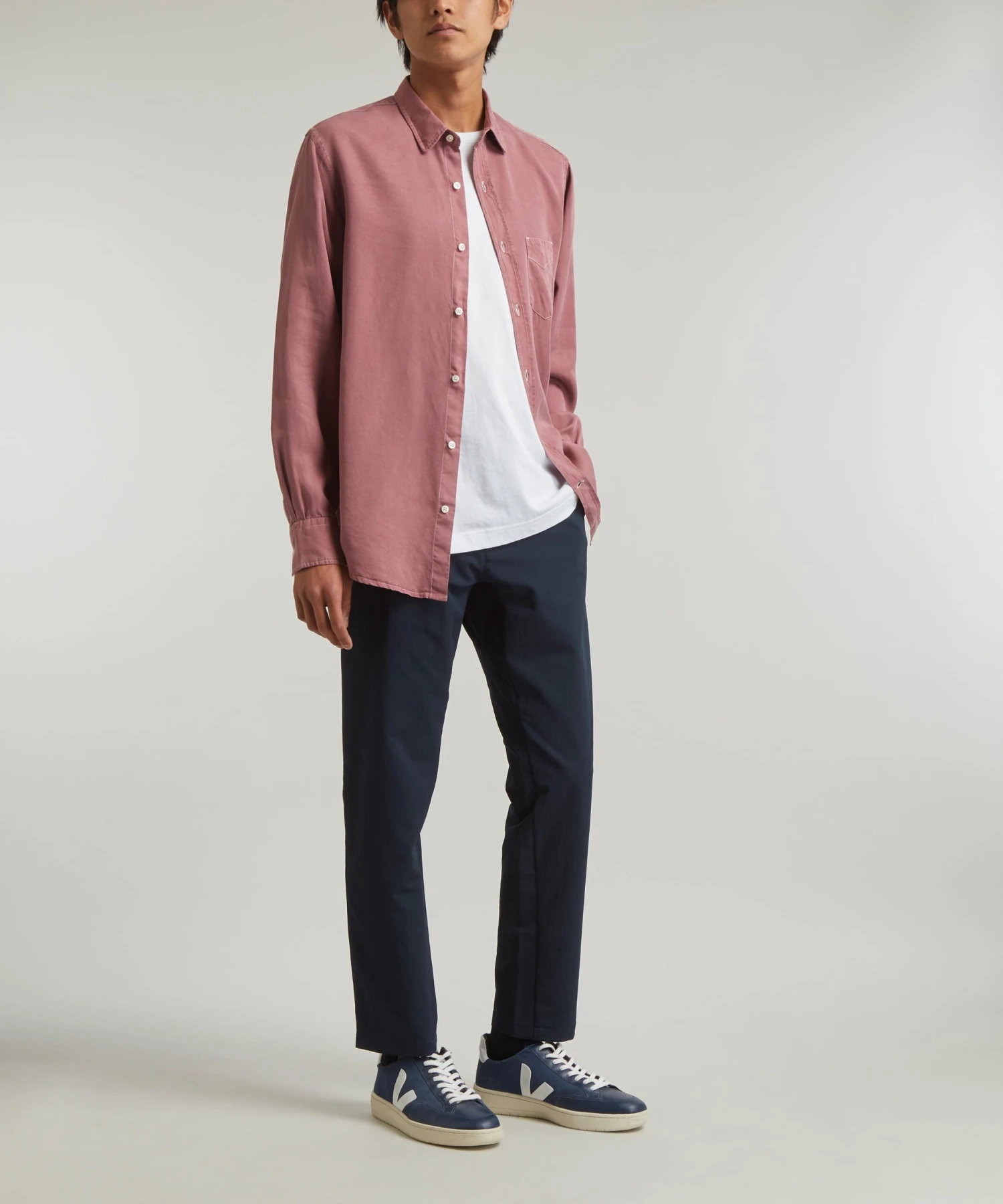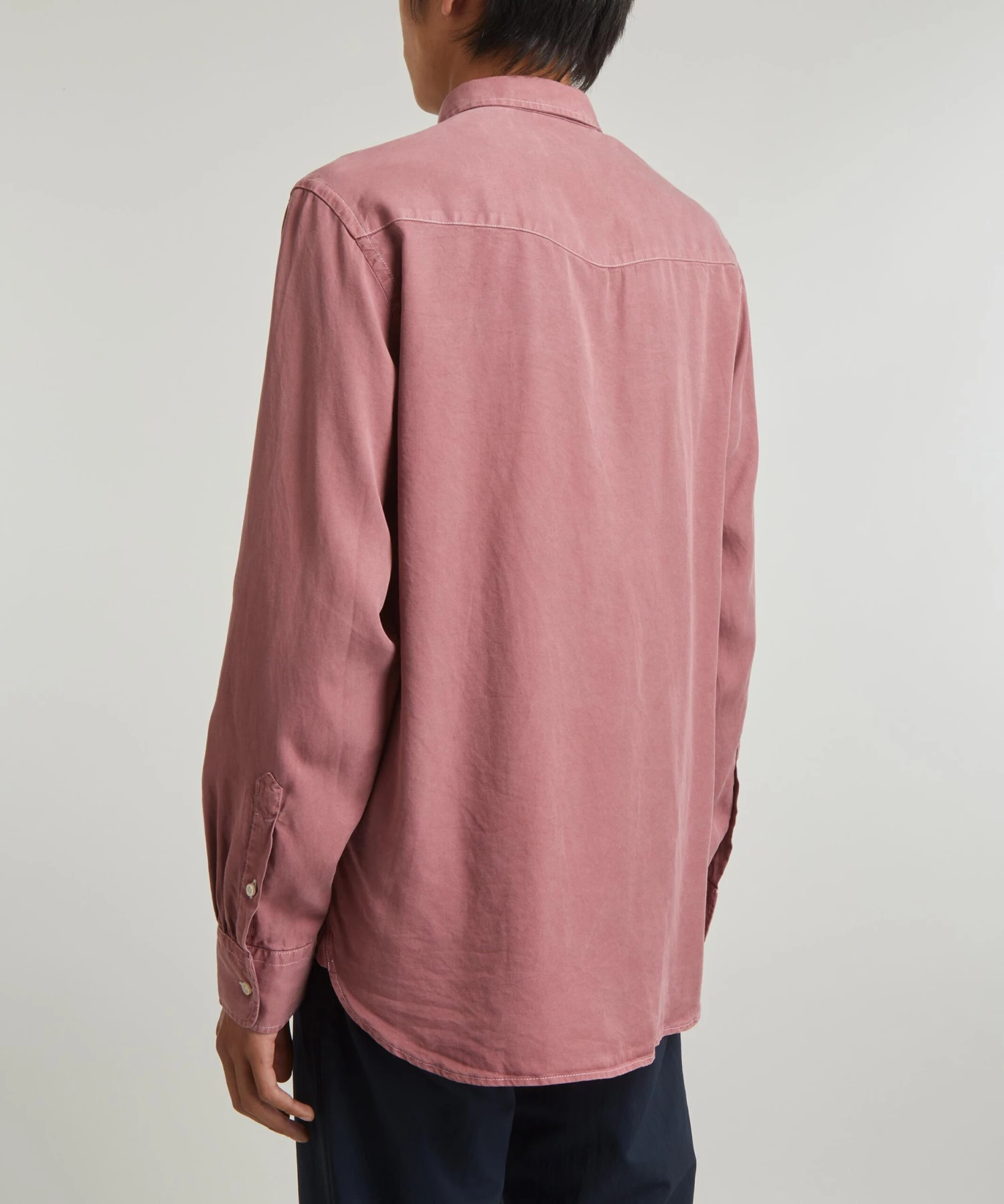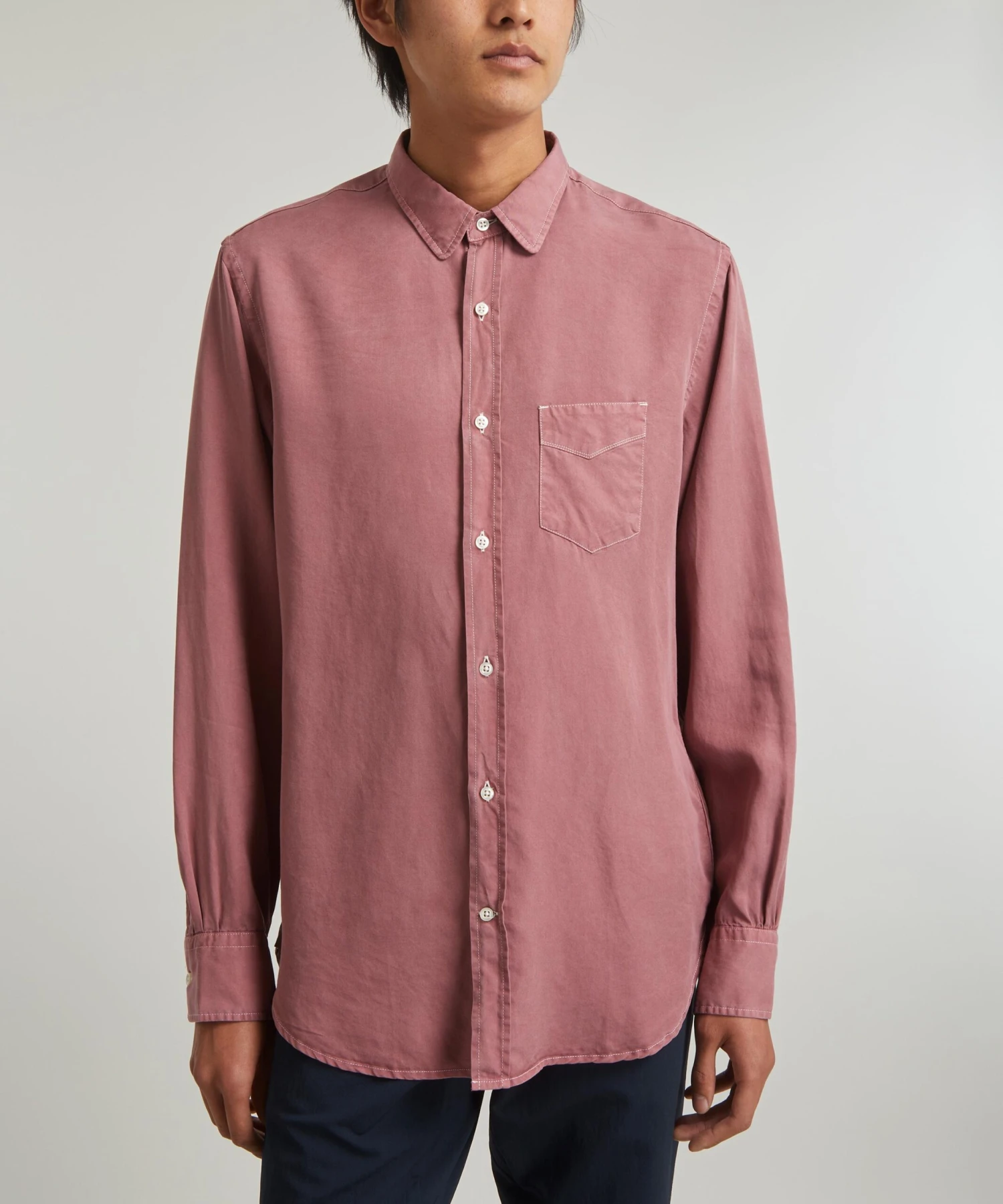 Crafted from pigment-dyed Tencel, this faded burgundy shirt features a rounded soft collar, long sleeves and a single patch pocket at the chest.