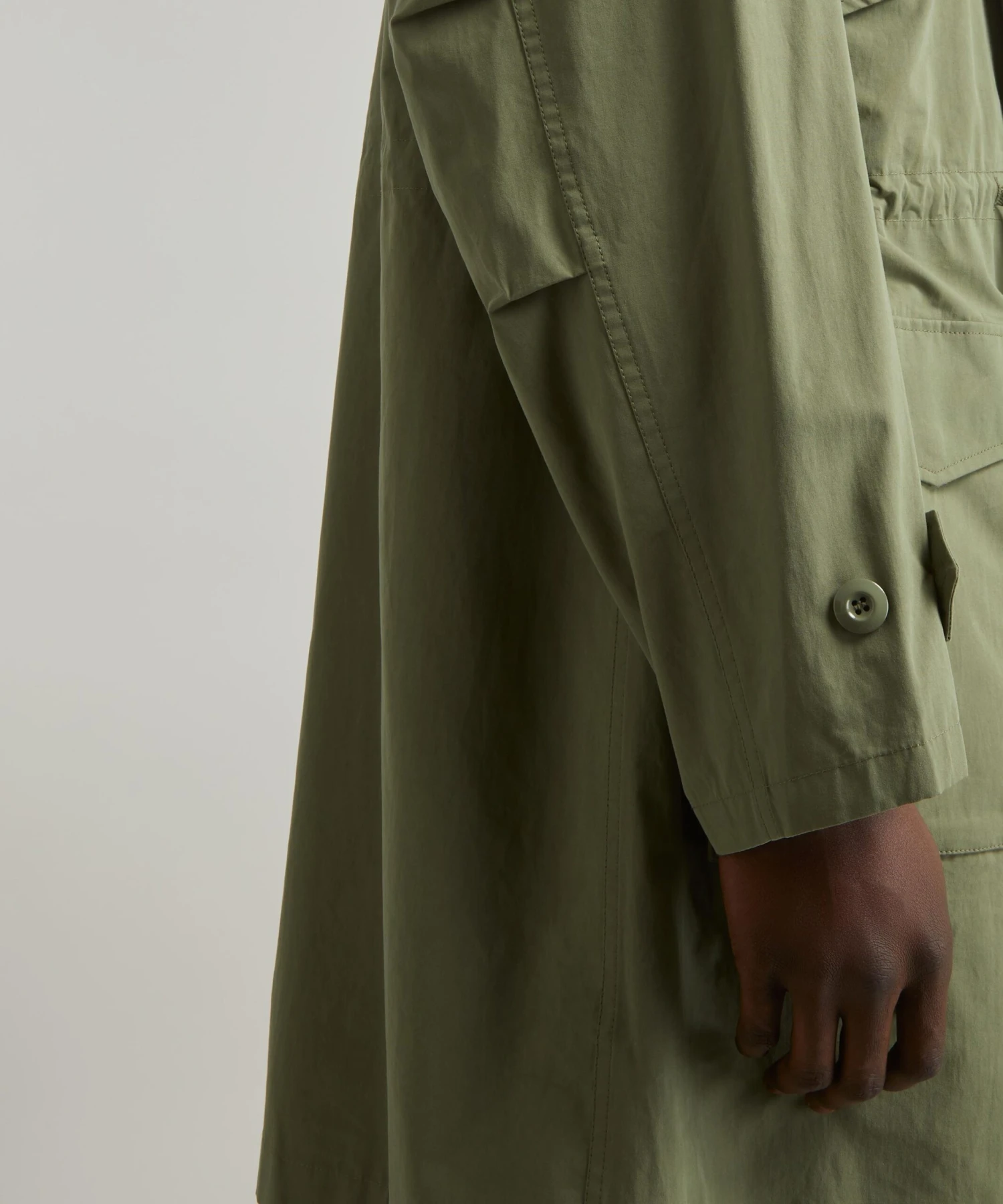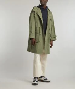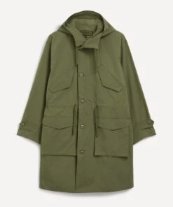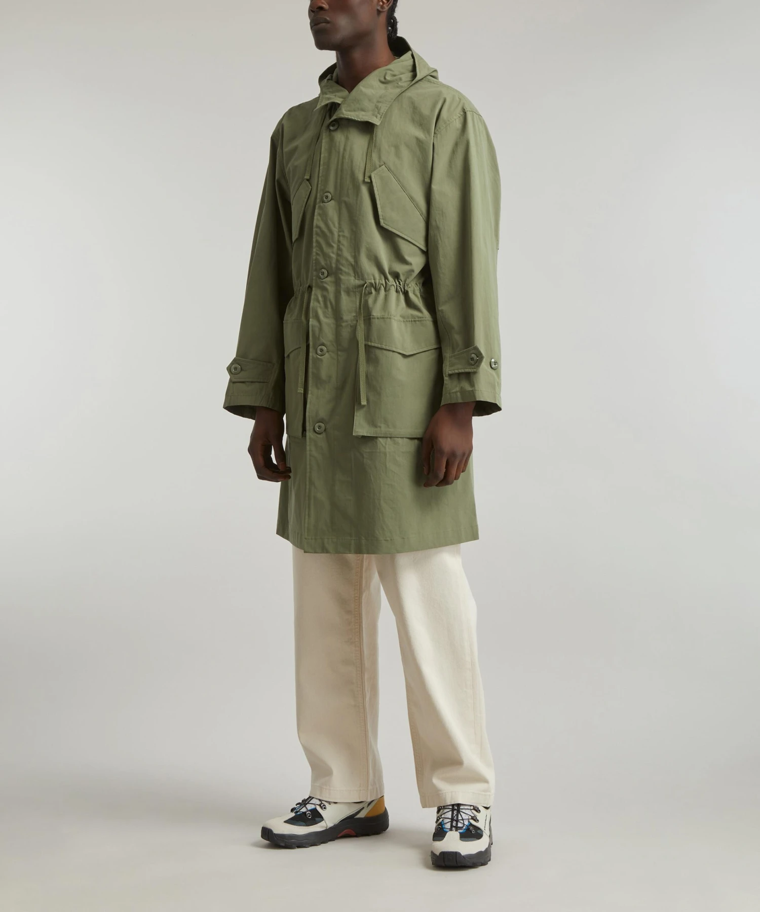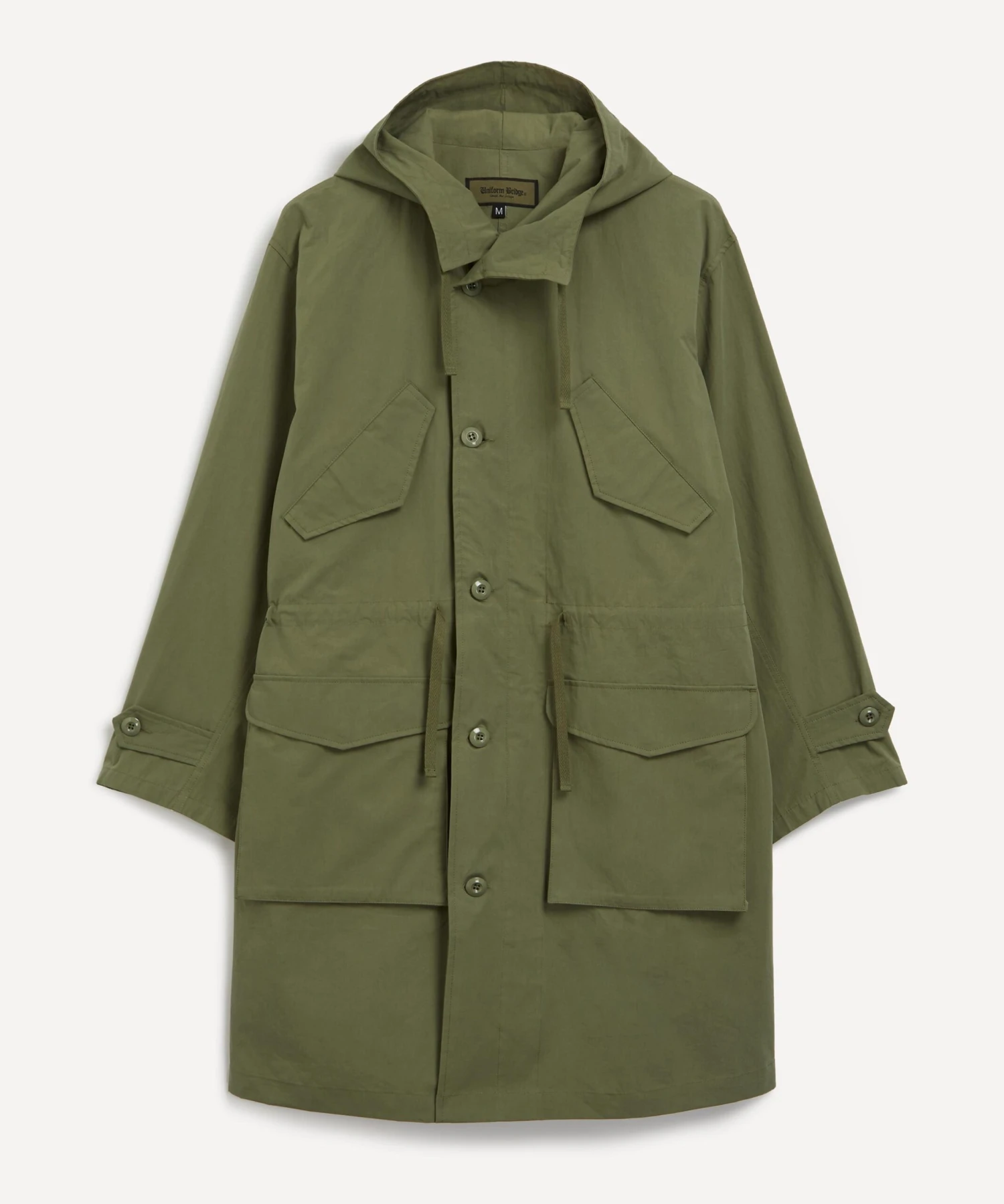 Crafted from khaki cotton twill, this contemporary take on the classic military style parka boasts a relaxed fit with dropped shoulders and adjustable, drawstring ties at the hood and waist. Fitted with a button and concealed zip closure, it features flap pockets at the chest and waist for an authentic utilitarian finish.