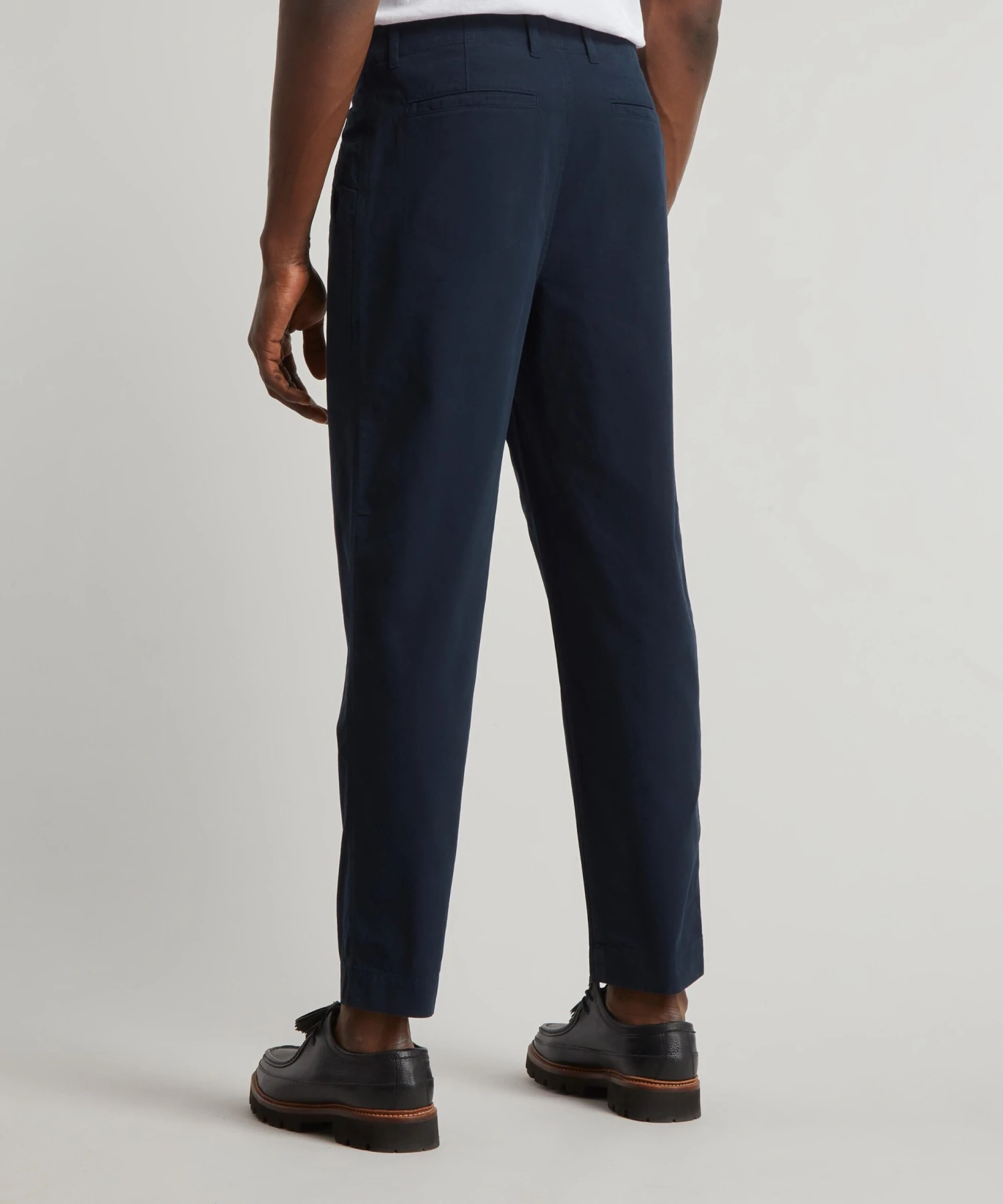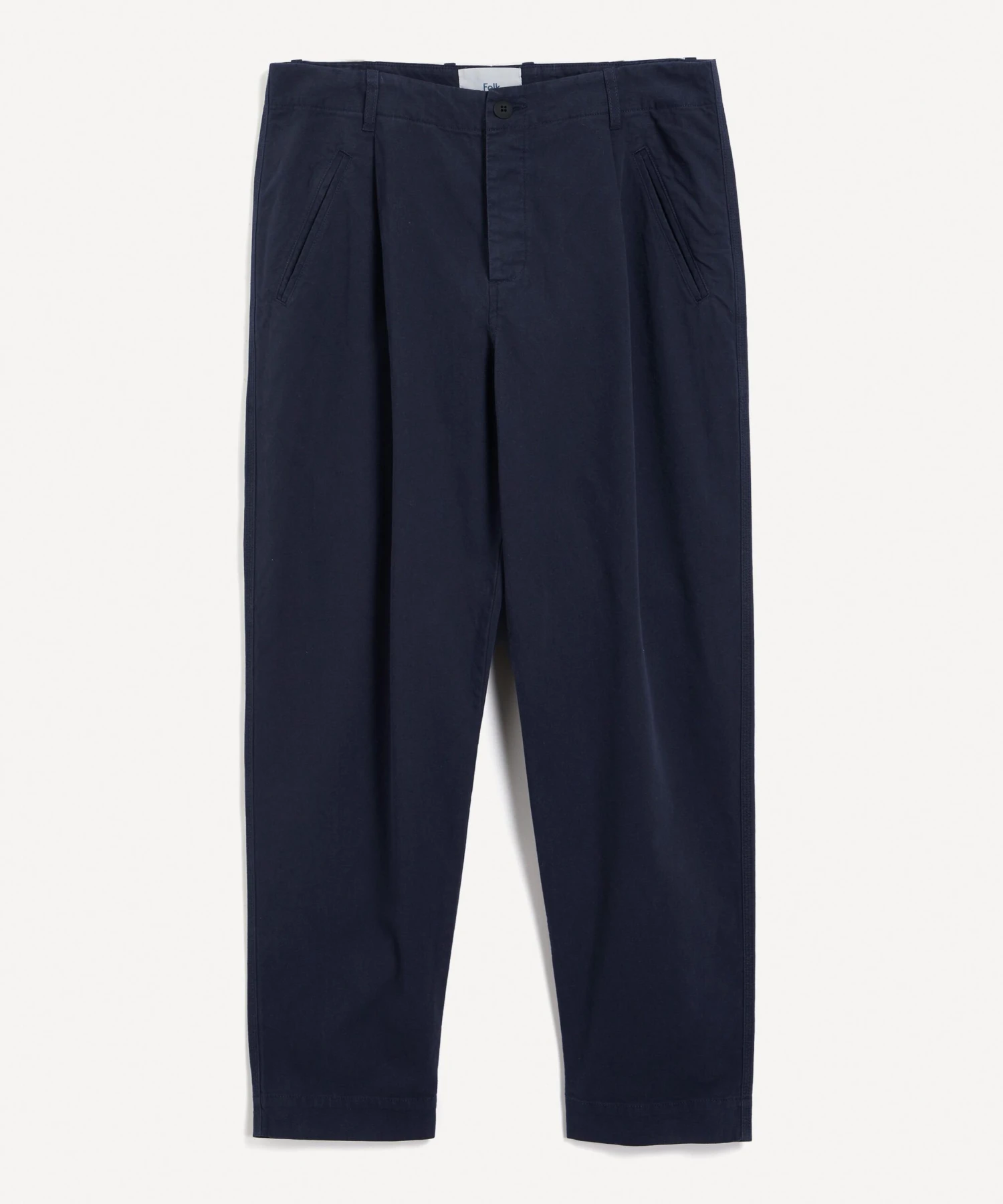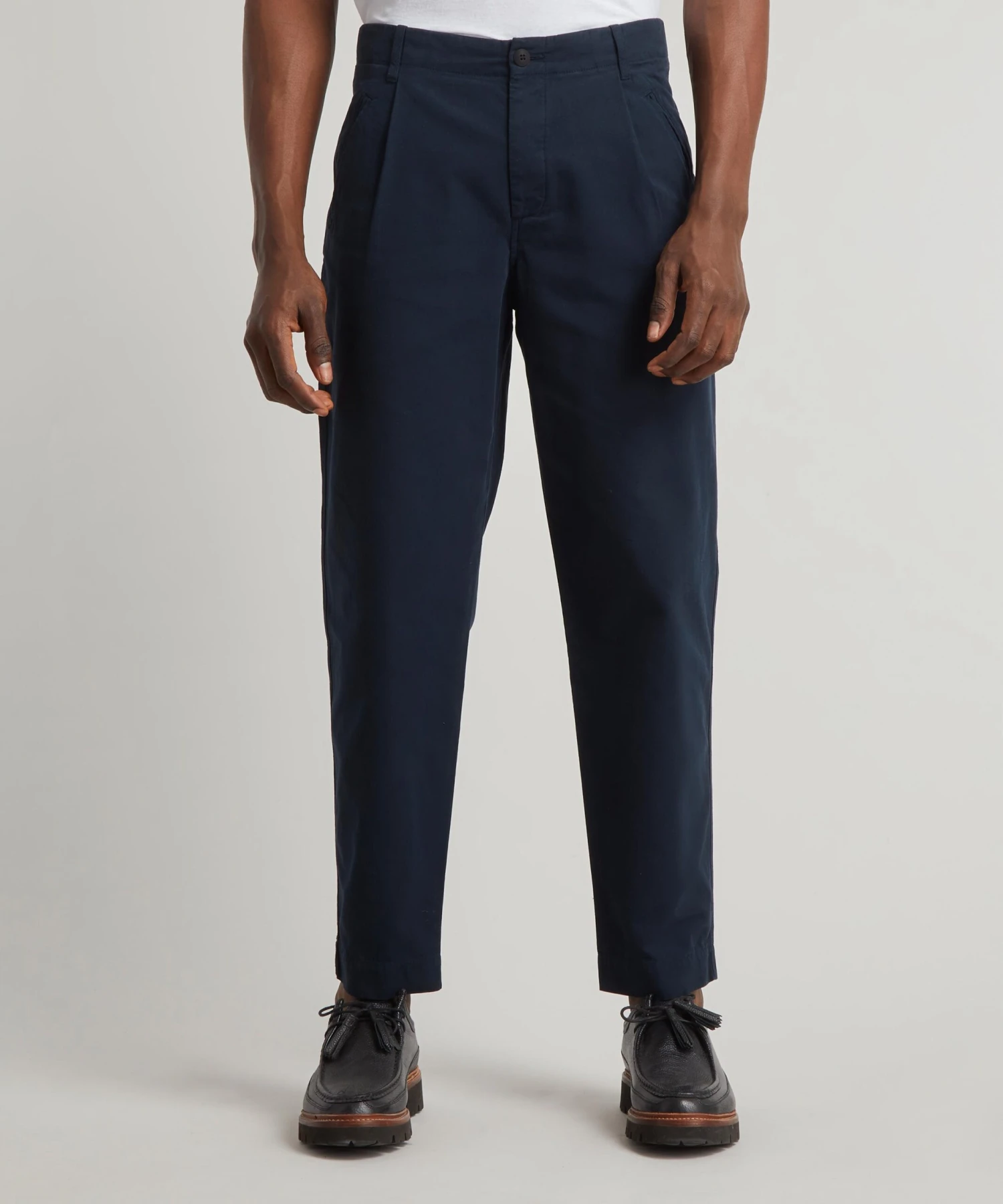 Boasting a relaxed, tapered silhouette cut to a cropped length, these pants are illuminated by a mid-indigo hue that partners perfectly with vibrant shades and muted tones alike. The pleat detailing to the front lends an elevated touch, meanwhile the concealed corozo button and fly closure weaves a functional finish. Unlined and completed with twin jet pockets, we love this pair partnered with a rouge t-shirt, navy utility jacket and sneakers.