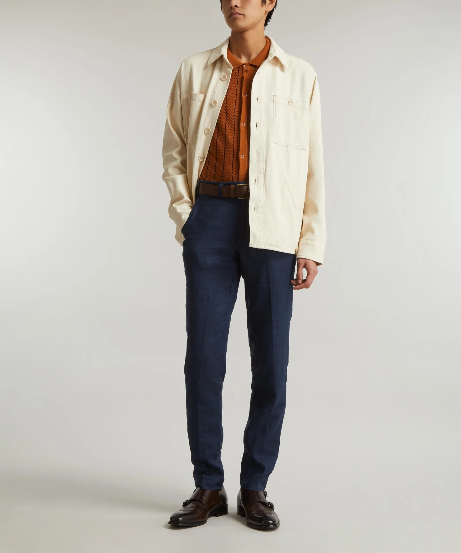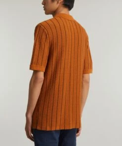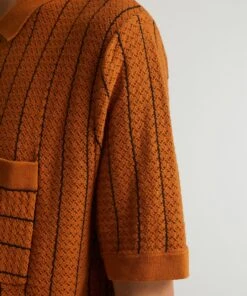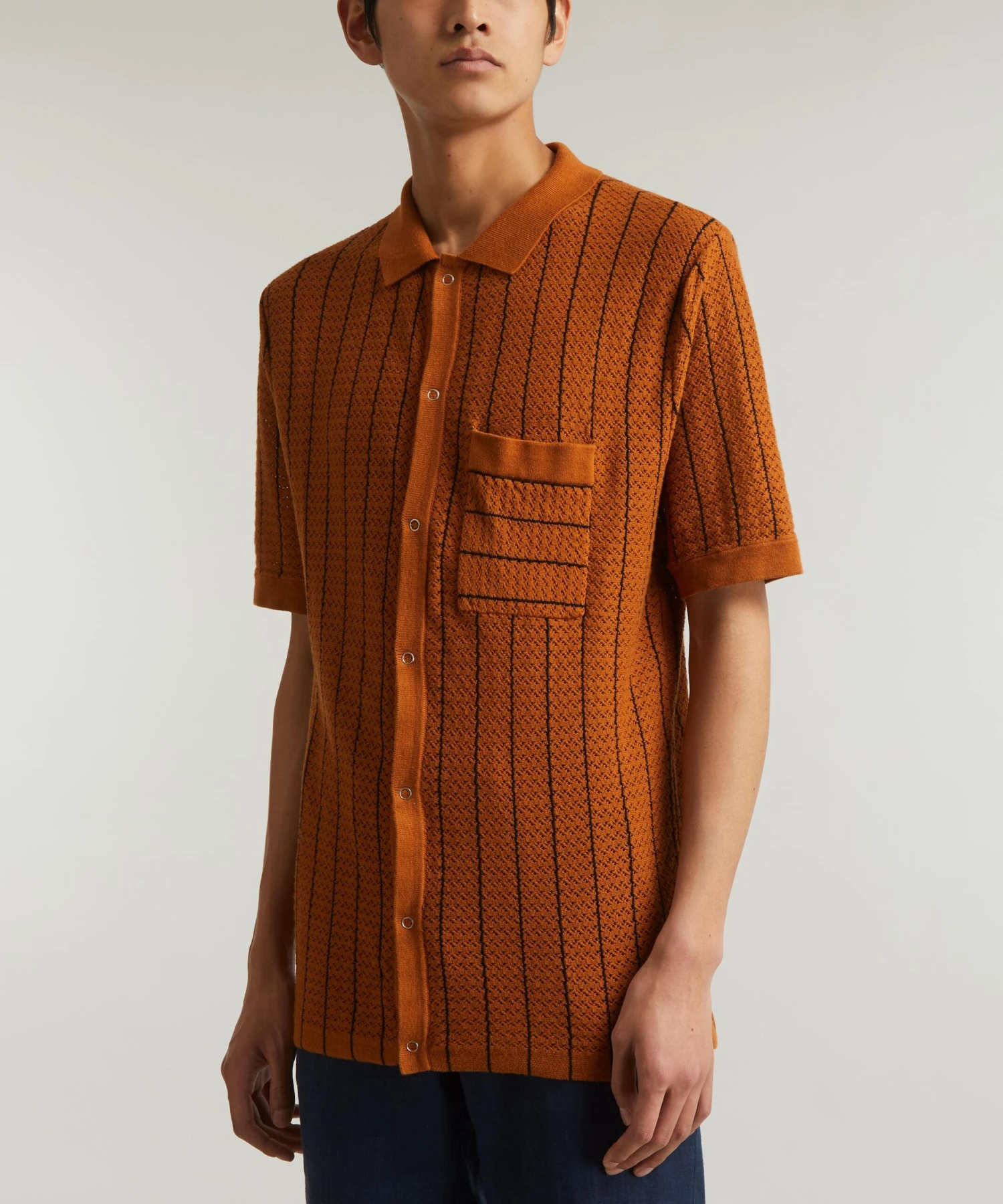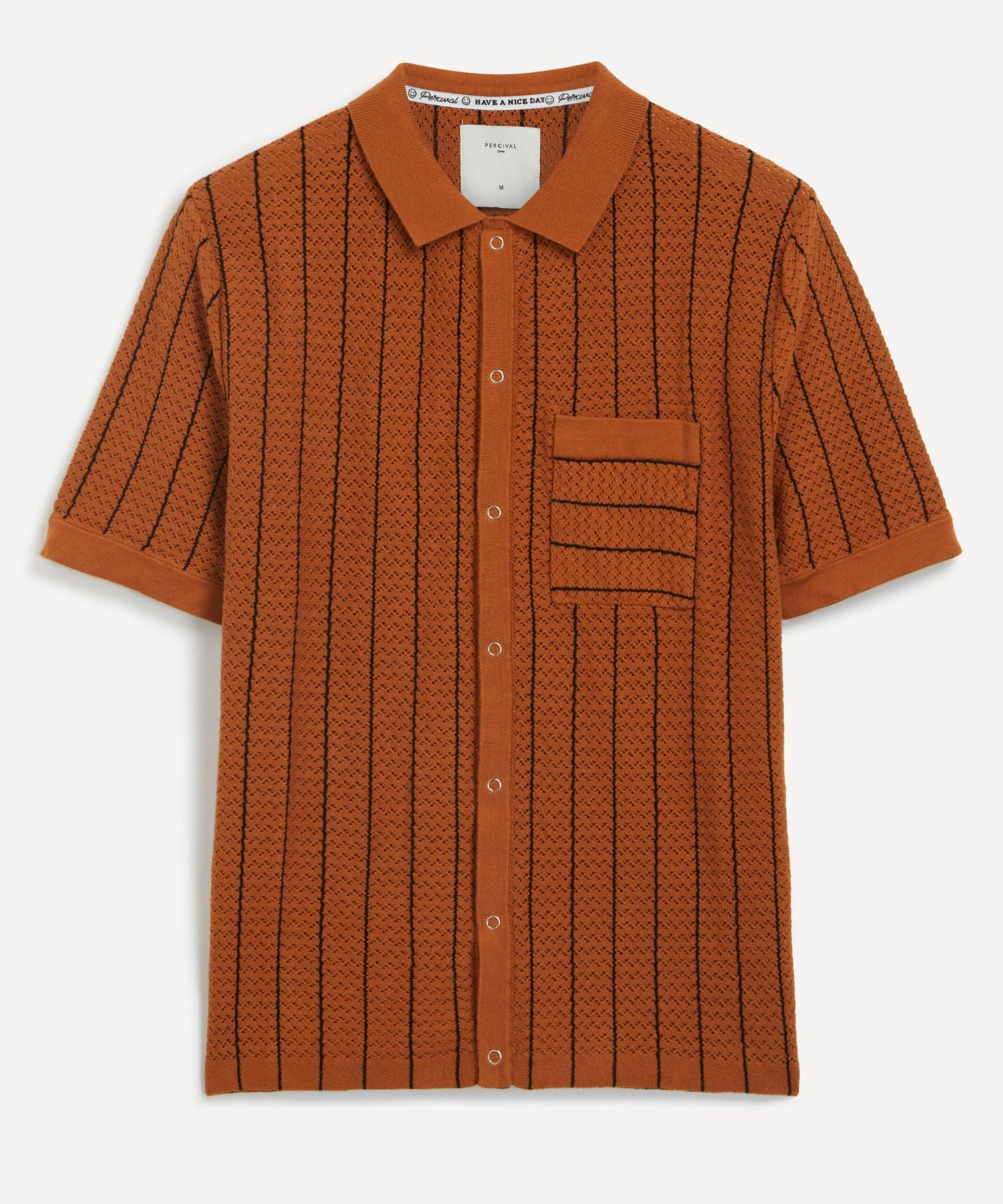 Percival creates subverted wardrobe staples that fuses quintessentially British styles with internationally sourced materials and designs, as demonstrated in the Nawa Pinstripe shirt. Knitted from toffee-brown cotton, this short-sleeve style features a classic polo-collar and a single chest patch-pocket, complete with a black pinstripe pattern throughout.
