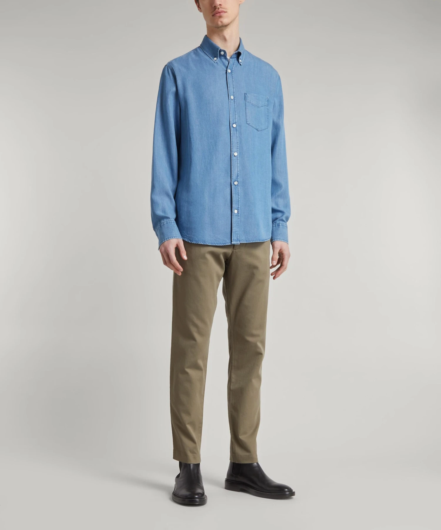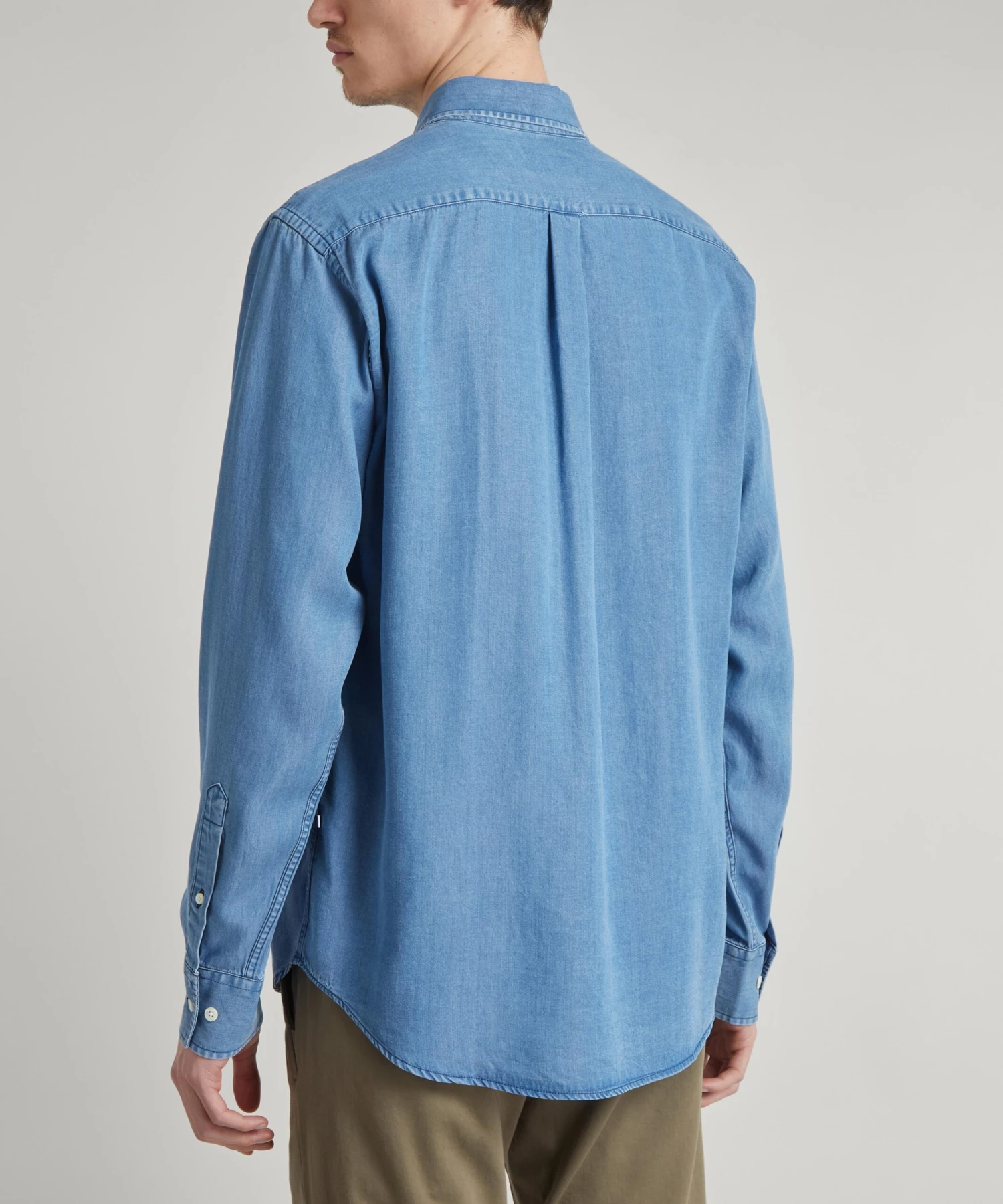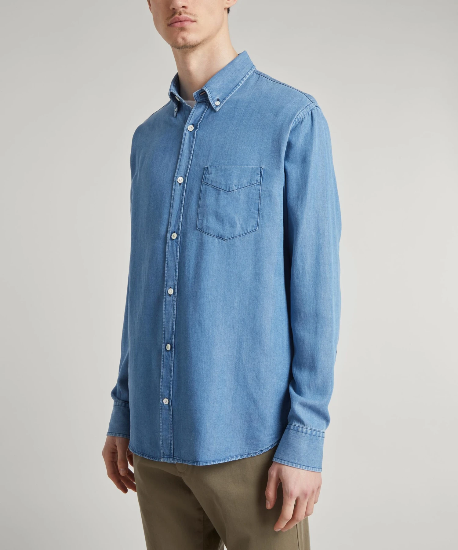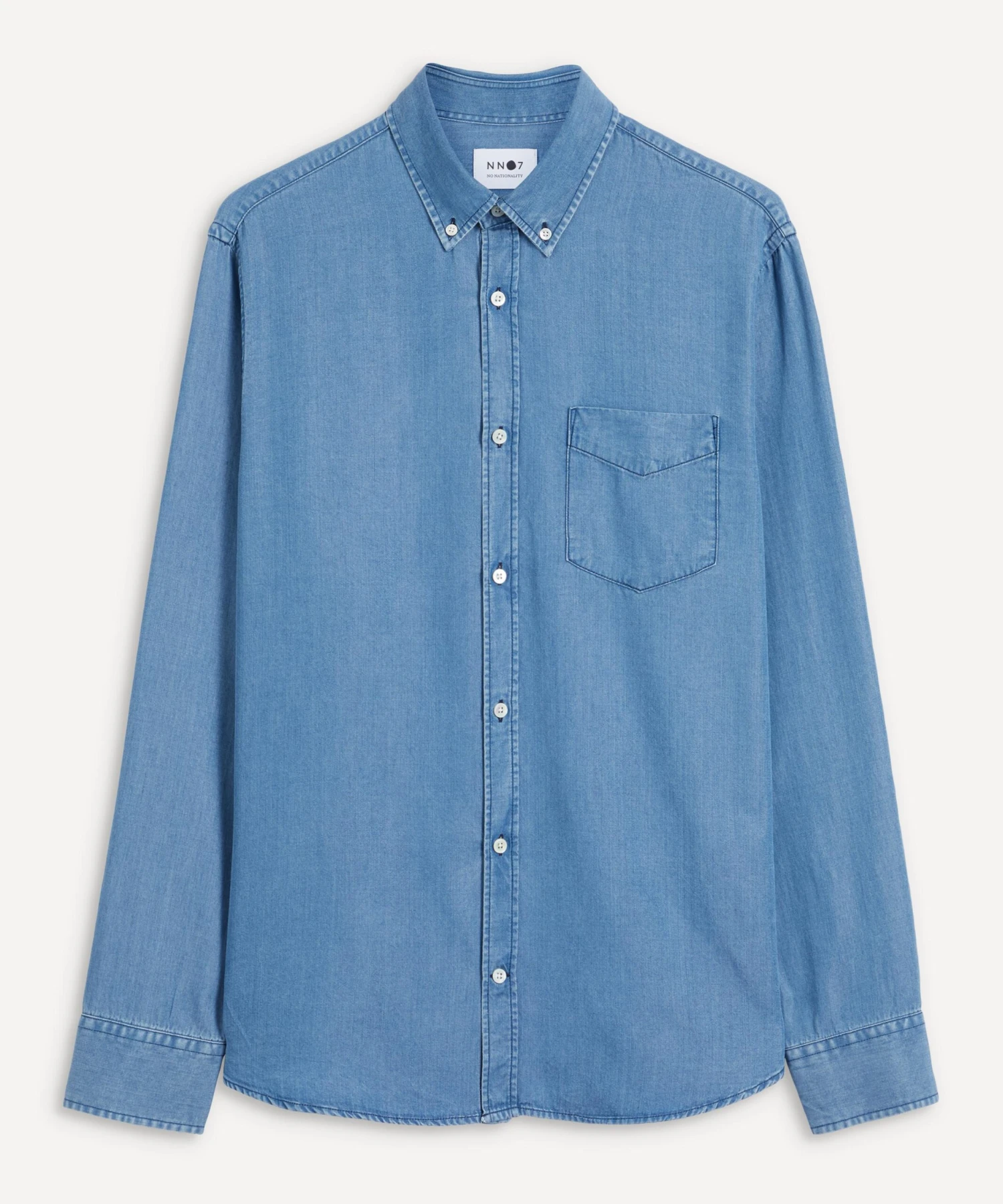 A Danish label with an international soul, NN07 treat us to another refined style in the form of the Levon shirt. Cut from lightweight Lyocell in a refreshing light-blue, this relaxed fitting shirt has a buttoned front and long sleeves. Complete with mother-of-pearl buttons on its buttoned collar, placket and cuffs, its single patch-pocket lends a formal touch to this casual style – perfect for work, or weekends with a basic t-shirt layered underneath.