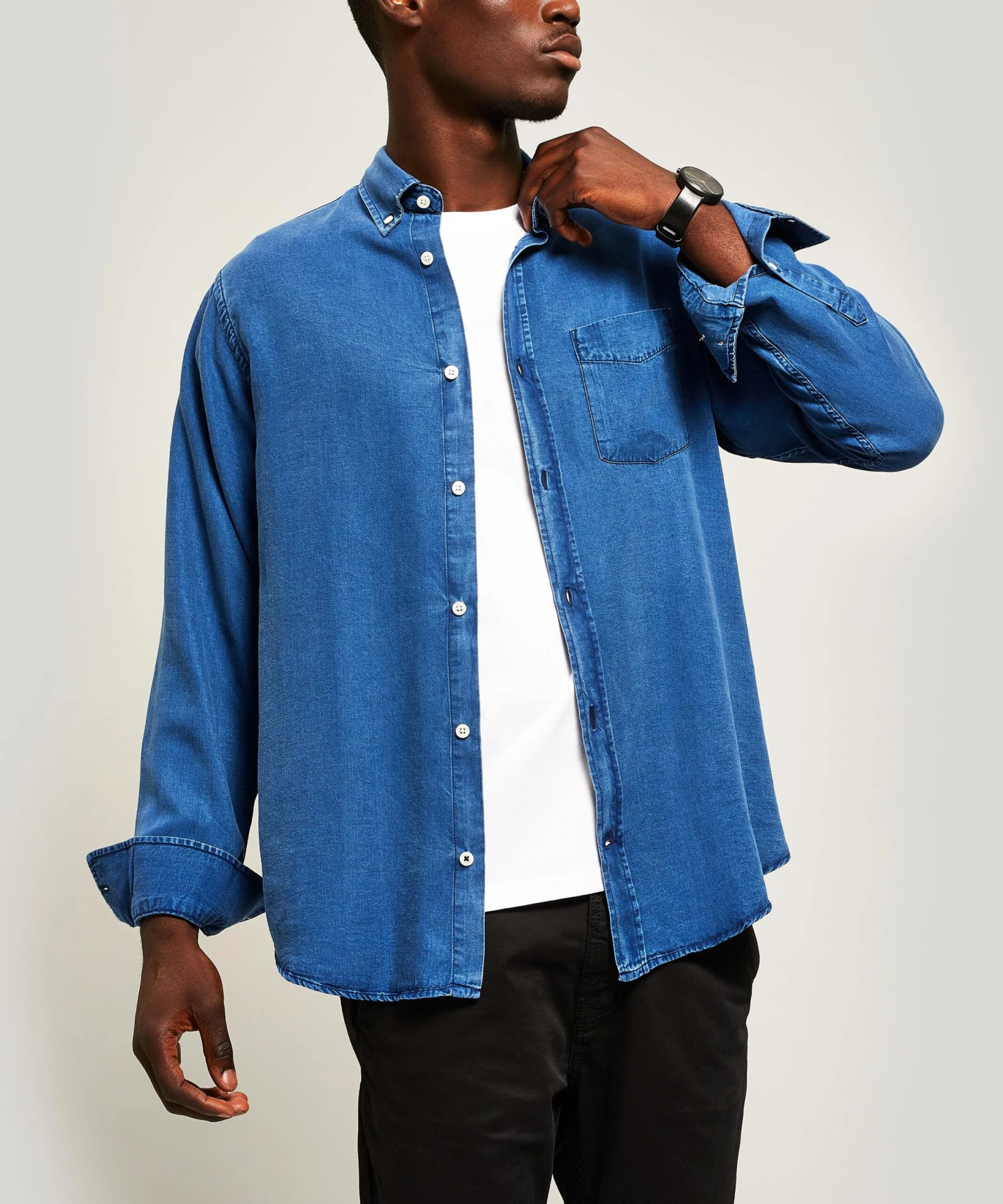 A Danish label with an international soul, NN07 treat us to another refined style in the form of the Levon shirt. Cut from lightweight Tencel, a sustainably produced crease-resistant fabric, it is naturally breathable and cut to a slim-fit. Made in Europe, it is indigo-dyed a deep blue shade and finished with contrasting pearlescent buttons. Add some everyday luxury to your off-duty wardrobe by styling as an overshirt with a plain or striped t-shirt underneath.