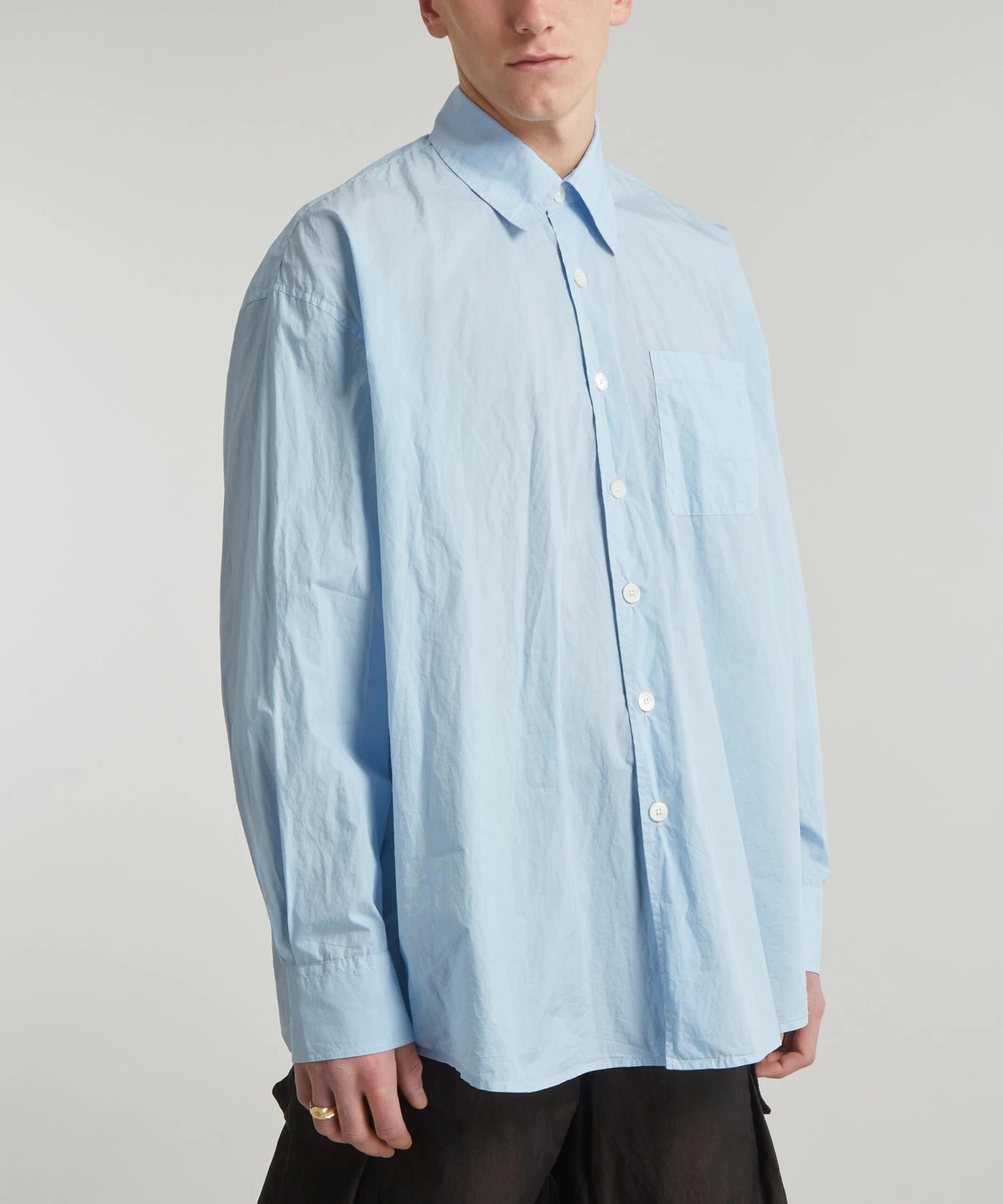 The Borrowed shirt from Our Legacy demonstrates the Scandinavian label’s irreverent spirit. Cut from an Italian cotton and polyamide-blend poplin fabric with a naturally creased finish for that ‘borrowed’ look, it’s designed for a wide, oversized fit with dropped shoulders, a single chest patch-pocket and mother-of-pearl buttons embossed across its placket.