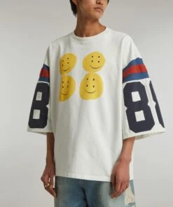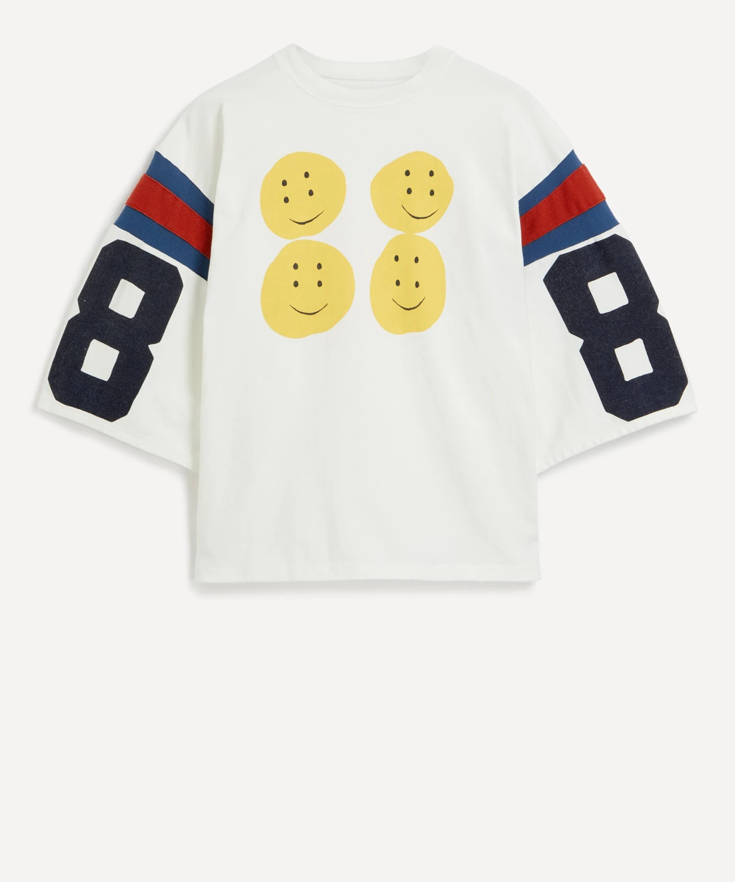 Designed with a modern, streetwear aesthetic, this oversized football t-shirt from cult Japanese label KAPITAL is a casual take on the classic American football jersey. Crafted from cotton jersey for a relaxed fit with signature ‘Smileys’ embossed across the front, its wide-cut dolman sleeves are emblazoned with printed squad numbers and sporty striped panels on the side.