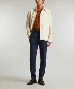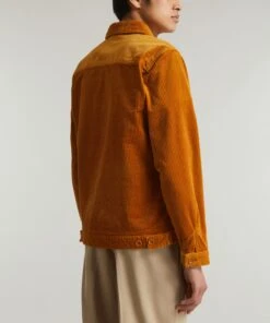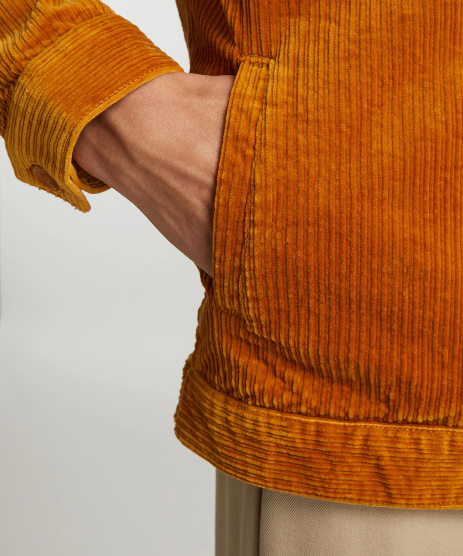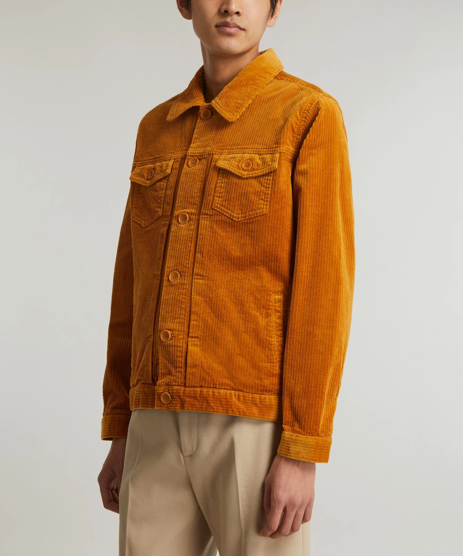 Percival creates subverted wardrobe staples that fuses quintessentially British styles with internationally sourced materials and designs, as demonstrated in the Pleated Denton jacket. Cut from yolk-orange corduroy suede in the style of a classic denim jacket, it’s fitted with a point collar, buttoned closure and multiple pockets for an authentic workwear aesthetic.