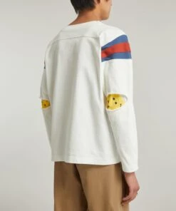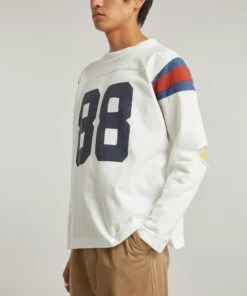 Designed with a modern, streetwear aesthetic, this Football T-shirt from cult Japanese label KAPITAL is a casual take on the classic American football jersey. Constructed from panels of cotton jersey with sporty striped shoulders and a printed squad number emblazoned across the front, it’s complete with signature ‘Smiley’ faces peeking through its ripped elbow patches.
