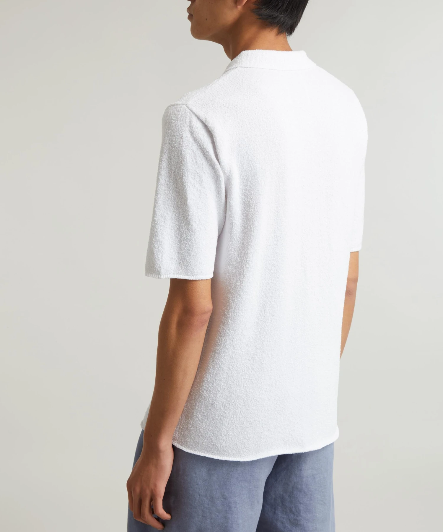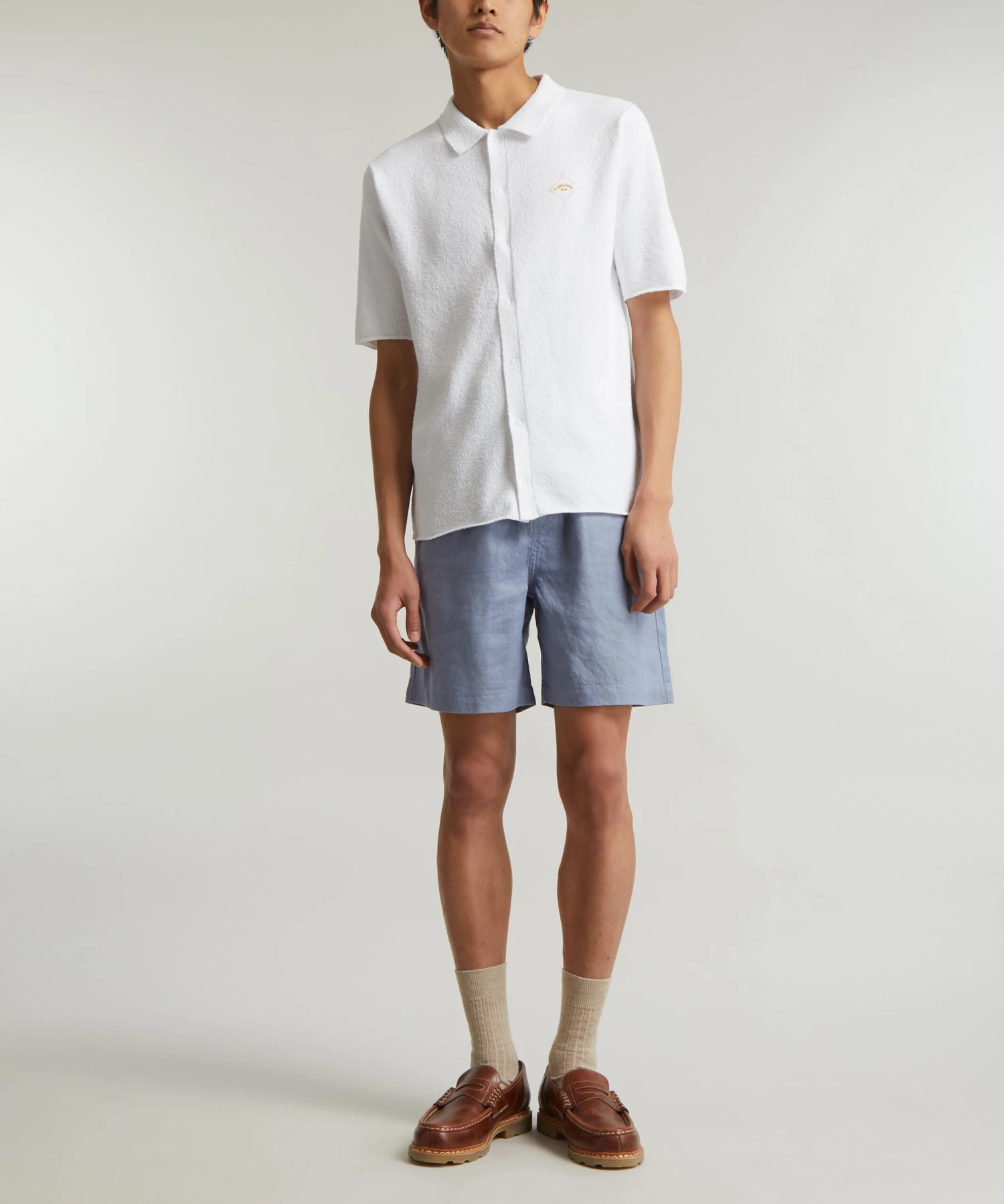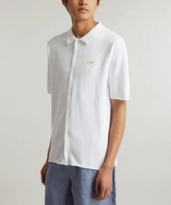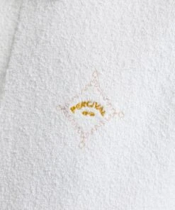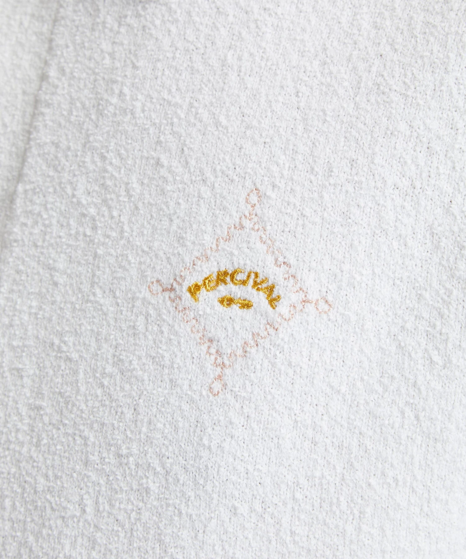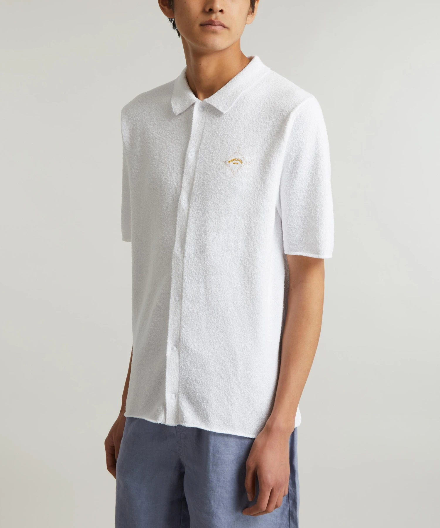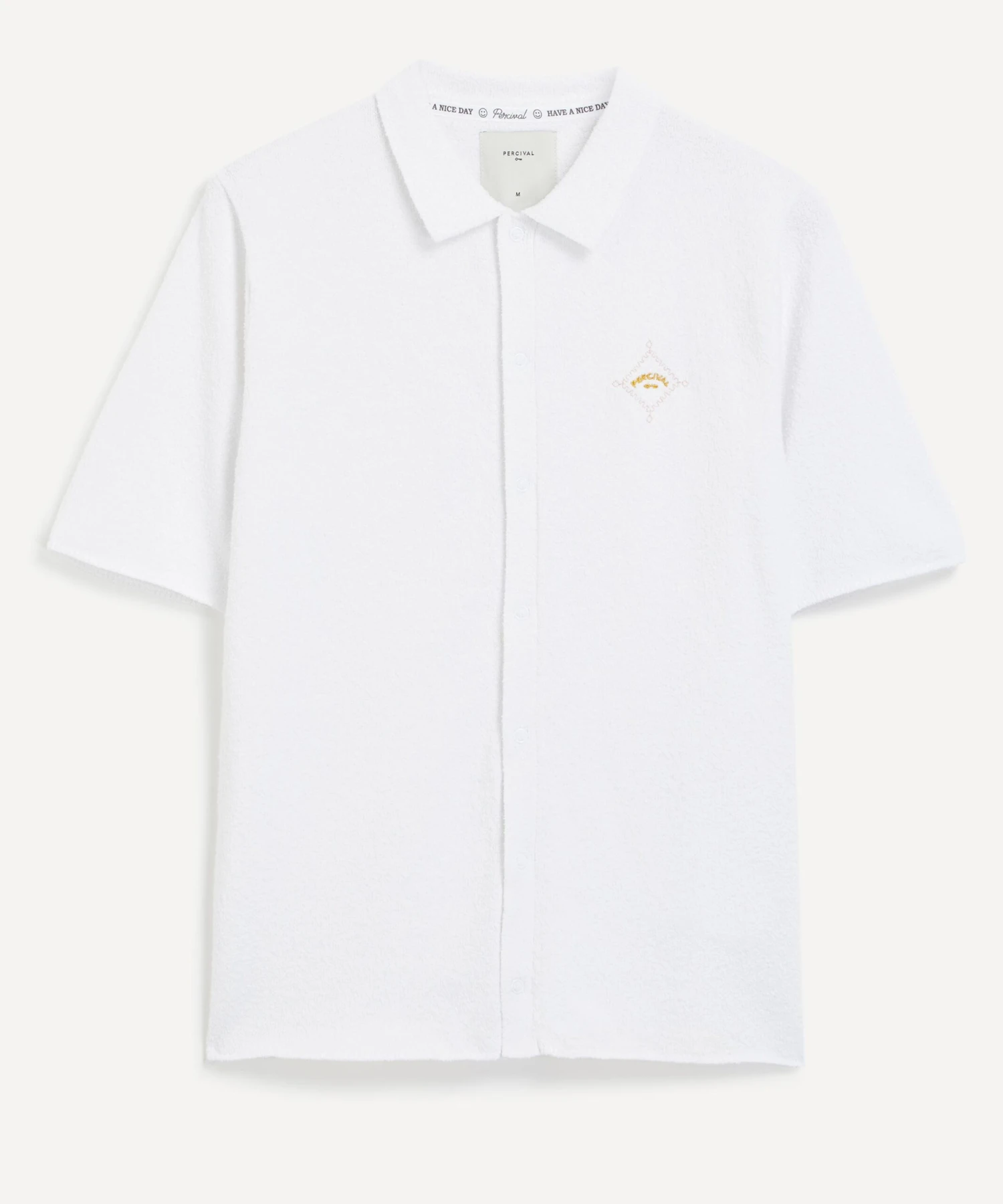 Percival creates subverted wardrobe staples that fuses quintessentially British styles with internationally sourced materials and designs, as demonstrated in the Receptionist Short-Sleeve shirt. Crafted from a super-soft bouclé cotton-blend to a classic fit, it’s detailed with gold logo branded embroidery at the chest in the style of a receptionist’s work uniform.