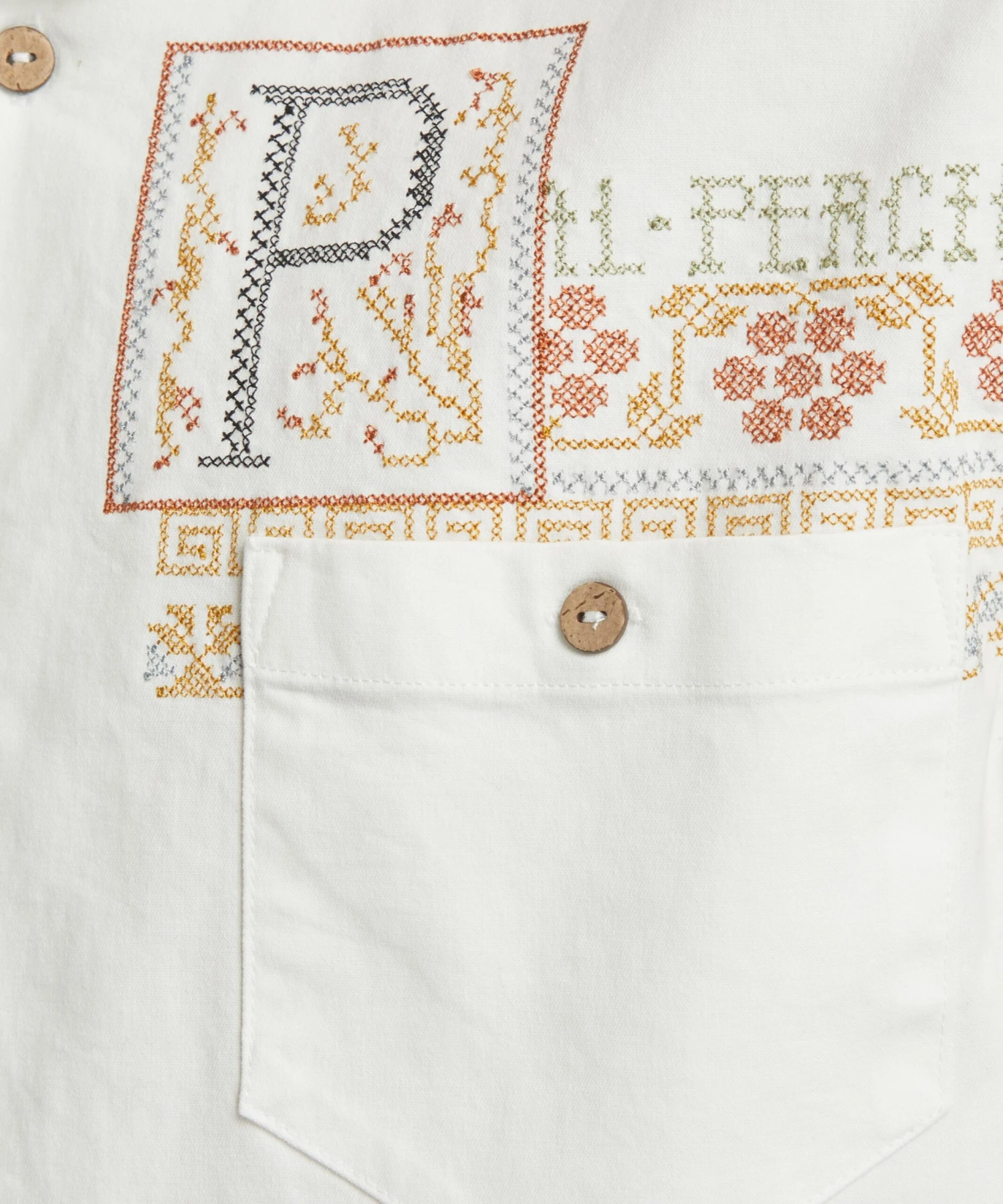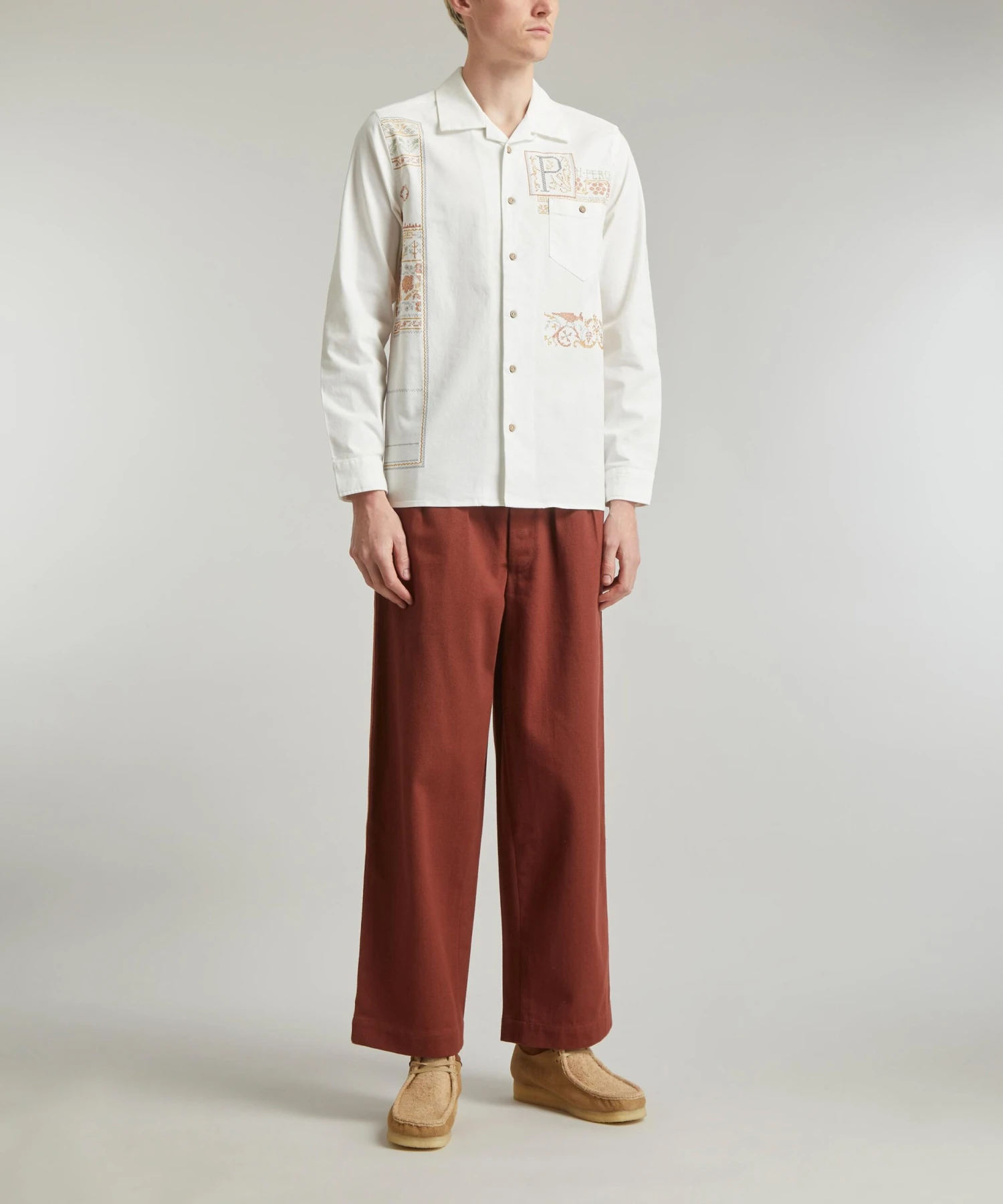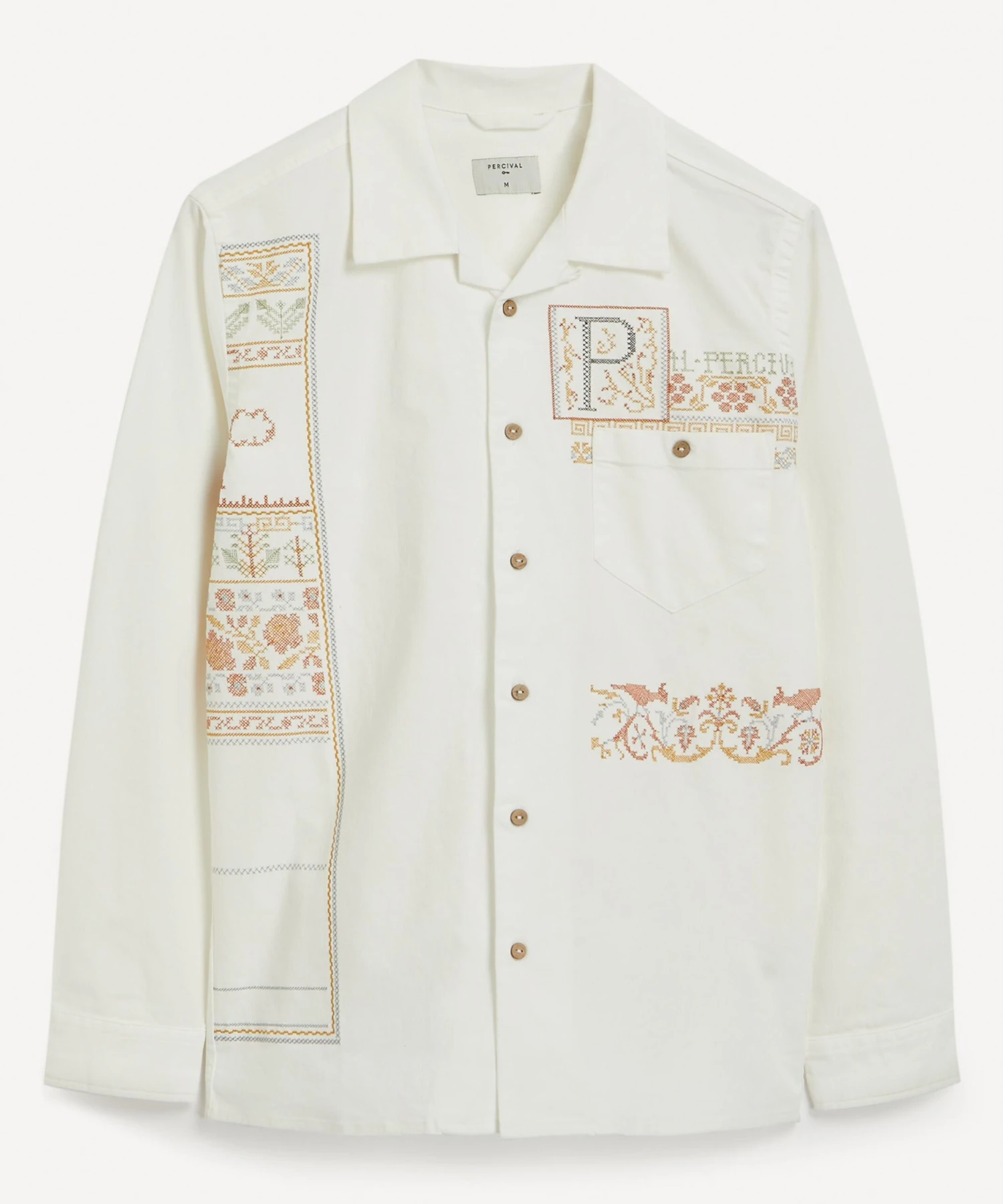 Percival creates subverted wardrobe staples that fuses quintessentially British styles with internationally sourced materials and designs, as demonstrated in the Tapestry Long-Sleeve Cuban shirt. Cut from linen with a classic Cuban collar and a buttoned chest patch-pocket, it’s detailed with intricate tapestry embroidery throughout.