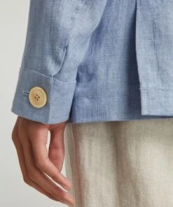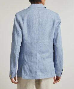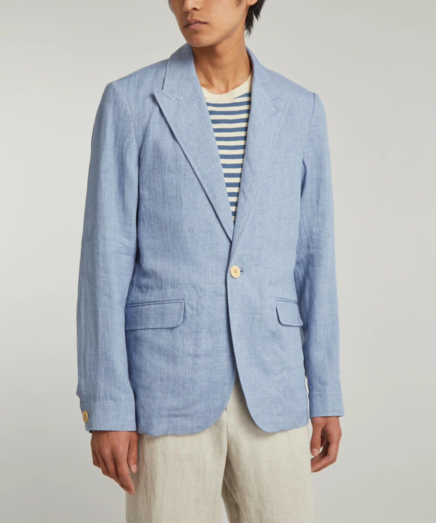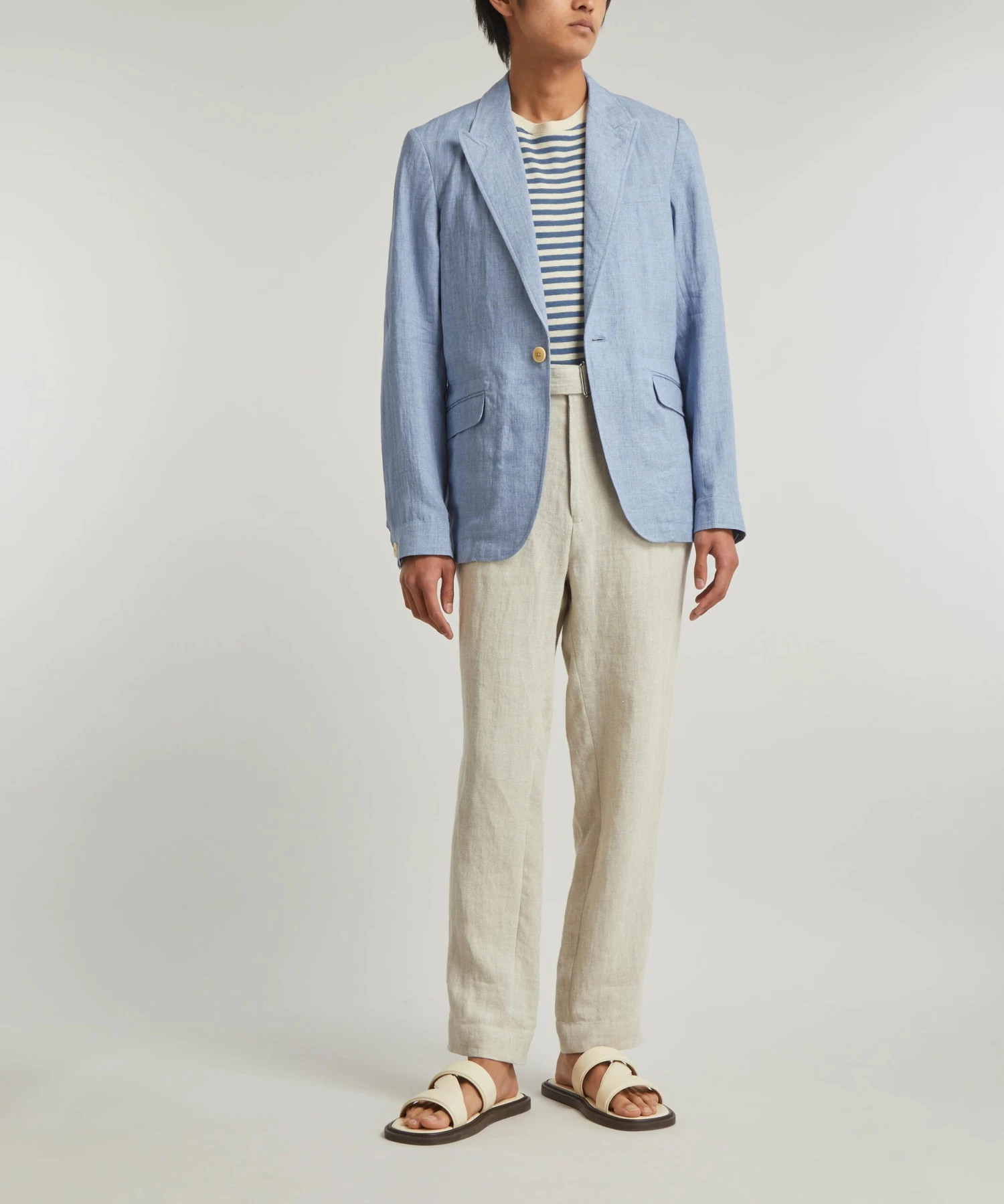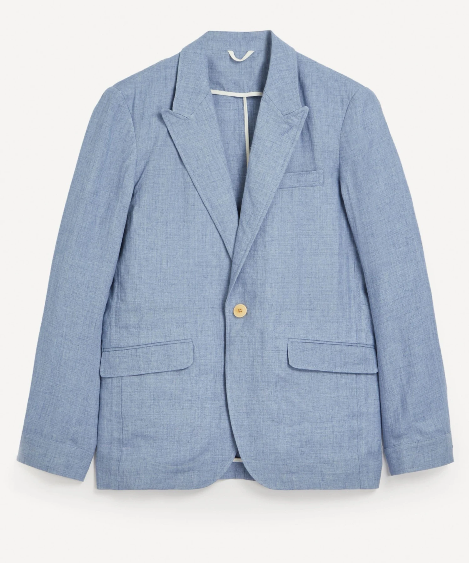 Cut from slubby sky-blue linen, this effortlessly sophisticated piece of relaxed, unstructured tailoring features a peak lapel, two front flap pockets and a single-button front fastening.