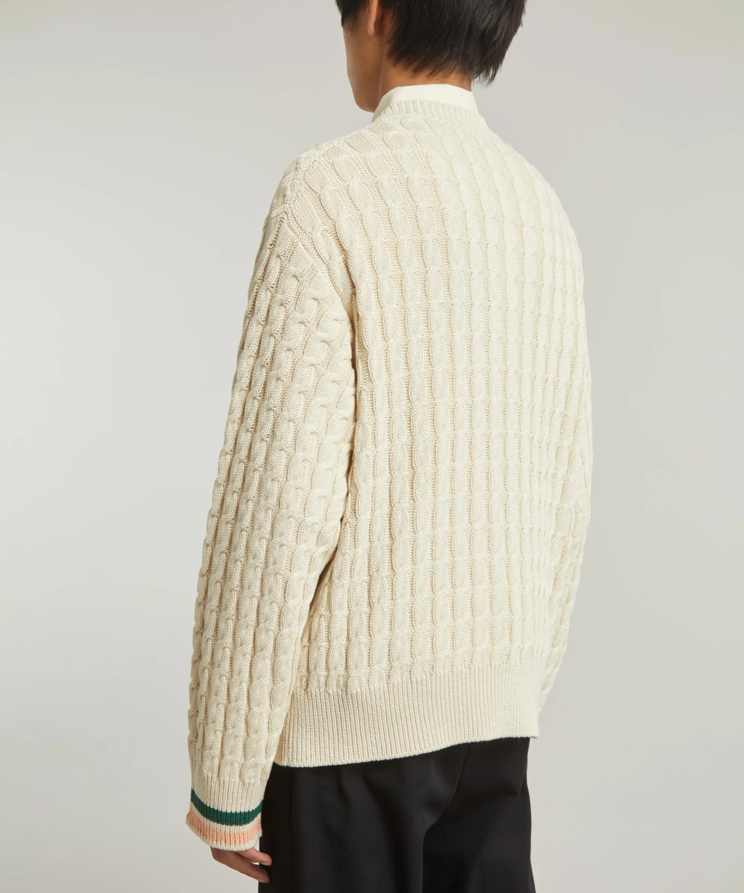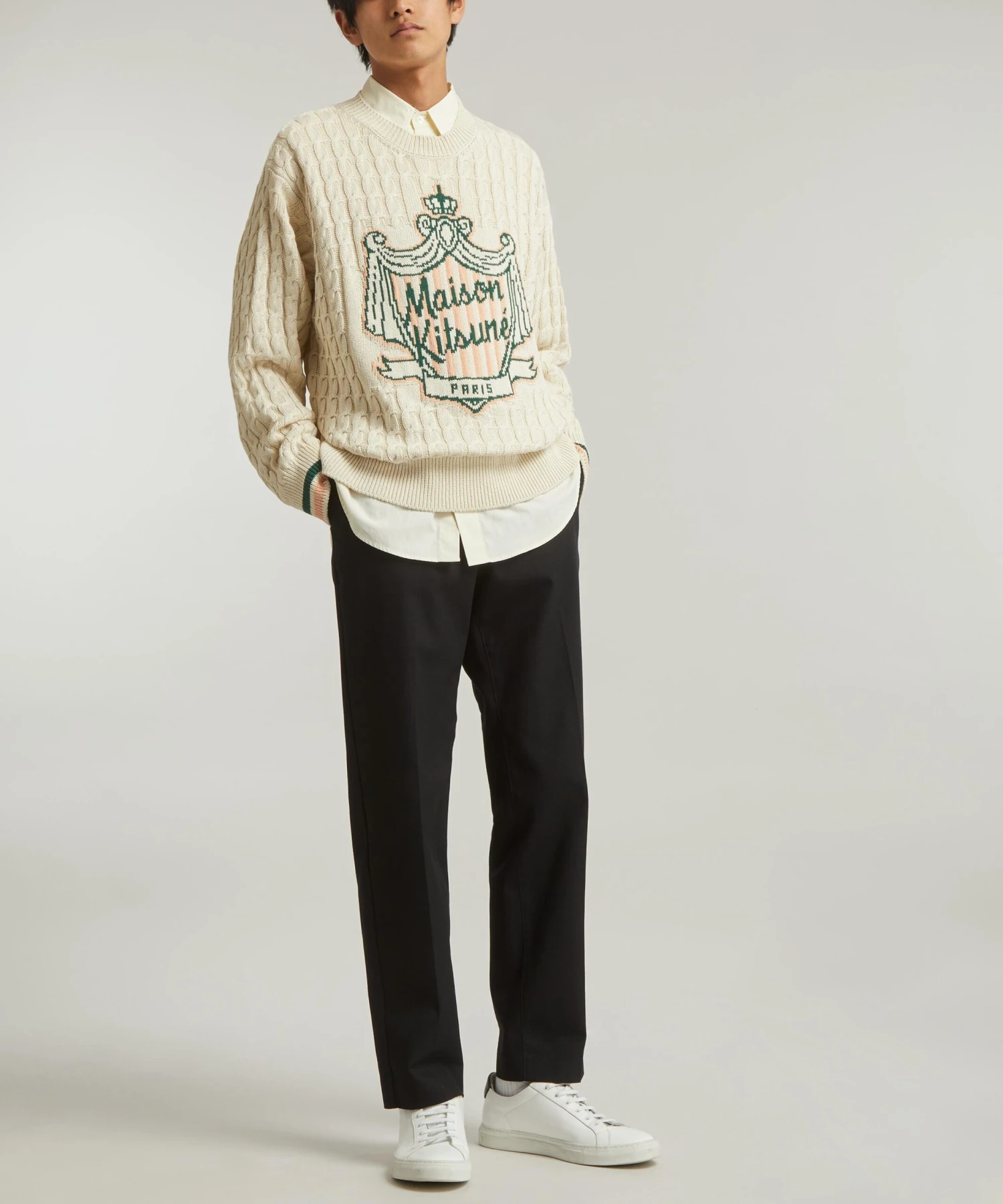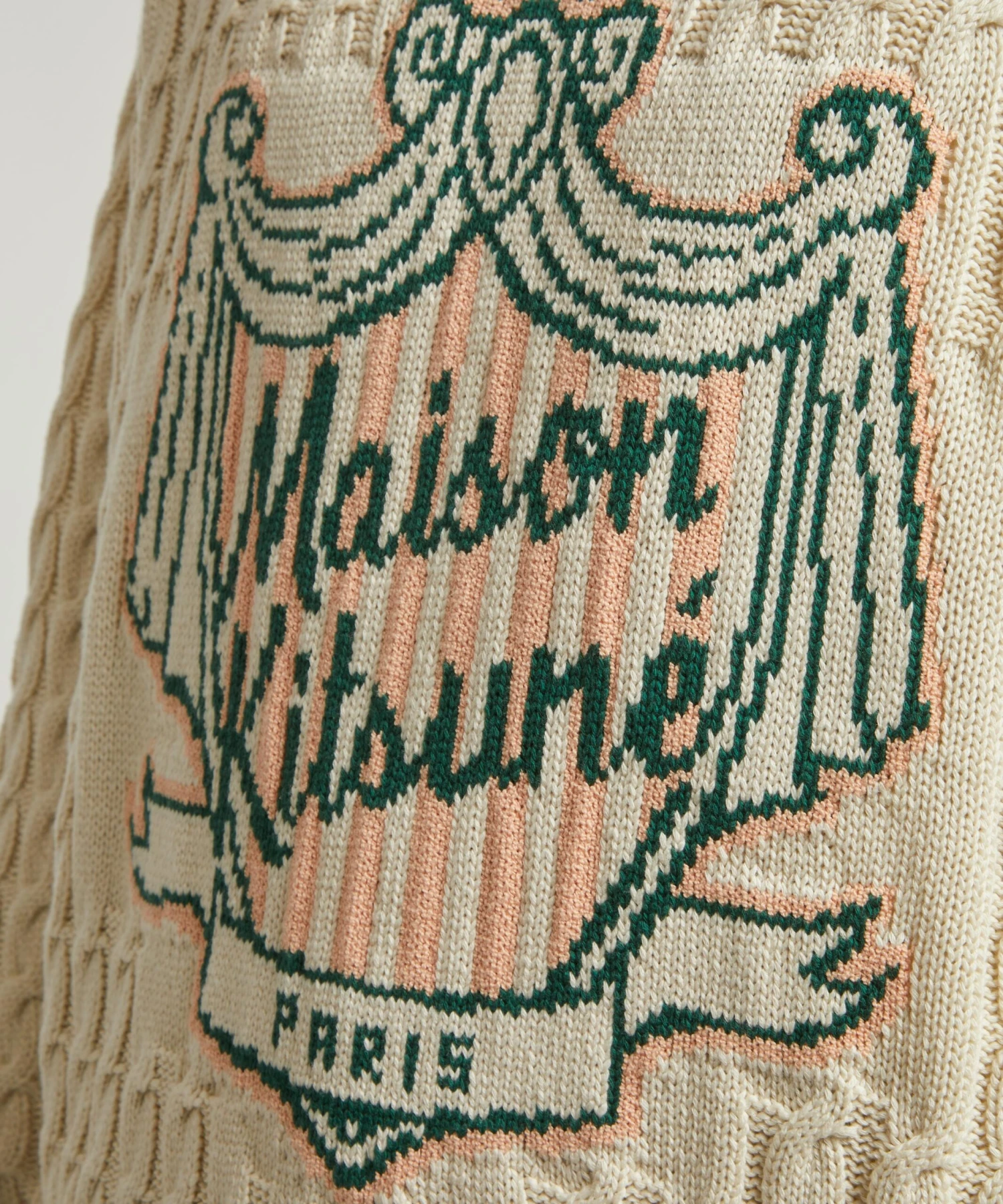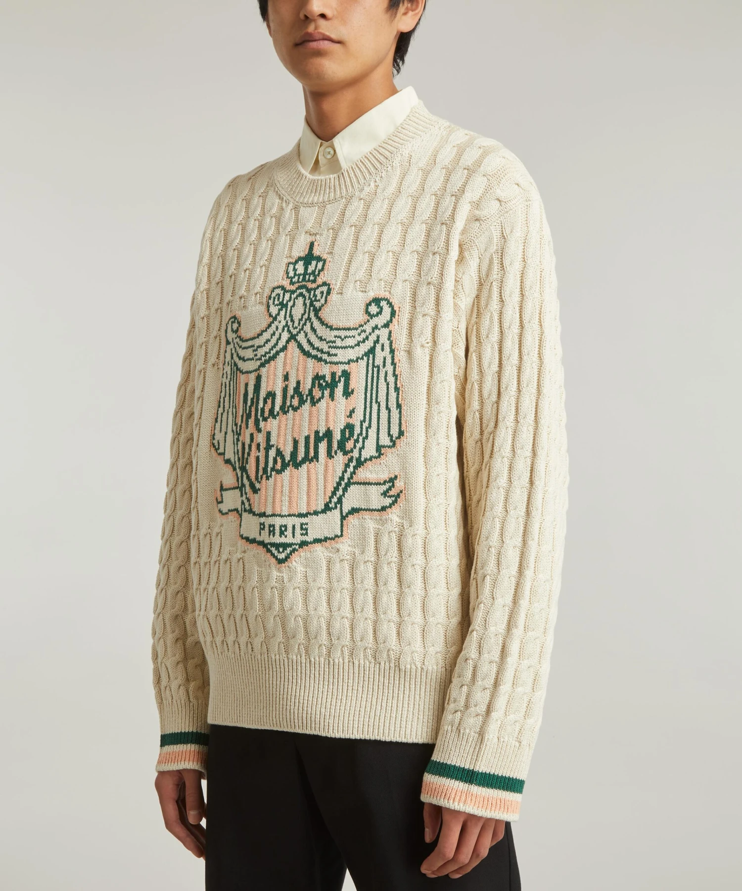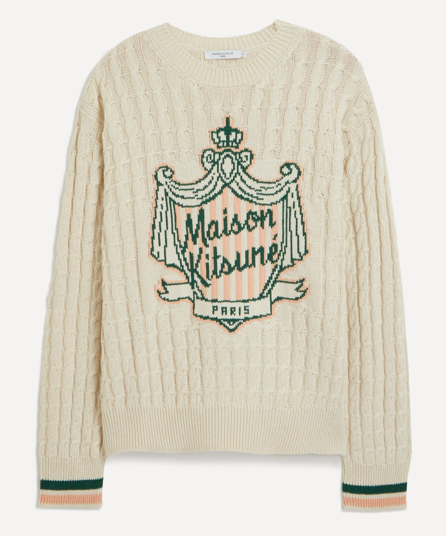 French fashion and record label Maison Kitsuné collaborates with Hotel Olympia to bring us the Crest Cable jumper – a casual take on classic collegiate styling. Crafted from a tactile, cotton-blend woven into a chunky cable-knit construction with sporty striped trims, its chest is emblazoned with a ‘Maison Kitsuné’ crest print for a retro finish.